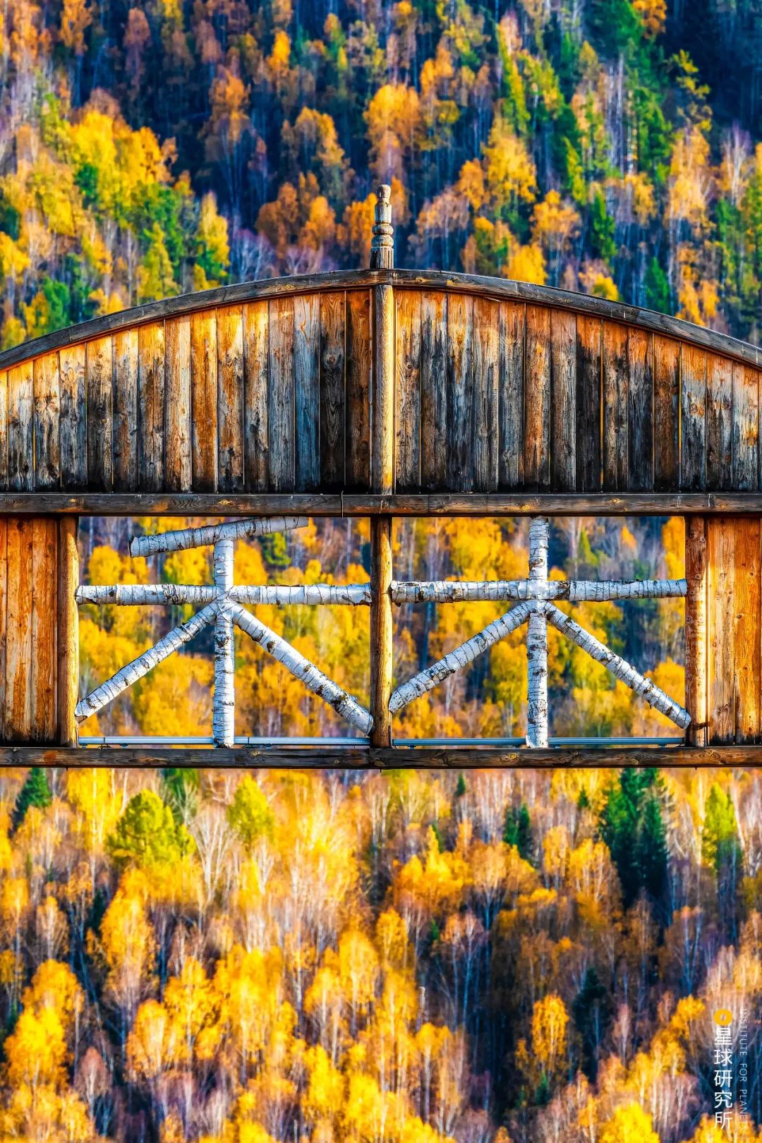 (喀纳斯禾木村的木制“禾木”牌坊,摄影师@焦潇翔)