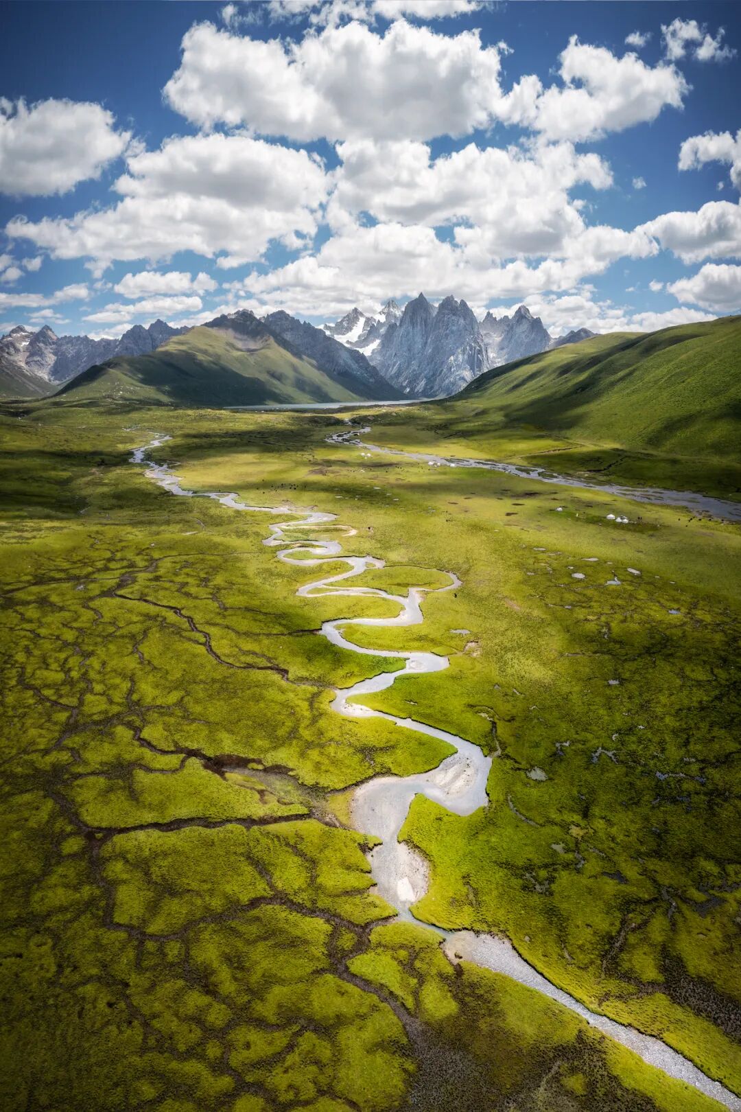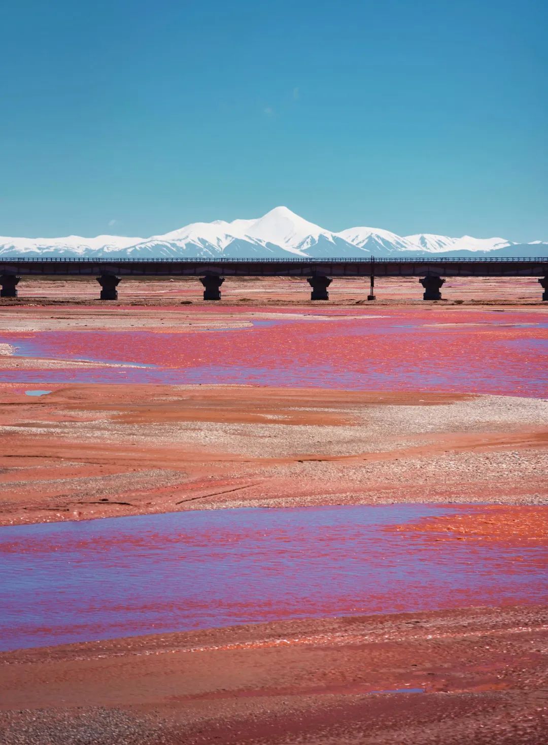 (横跨河道的青藏铁路桥和远处的玉珠峰,摄影师@梦旅人)