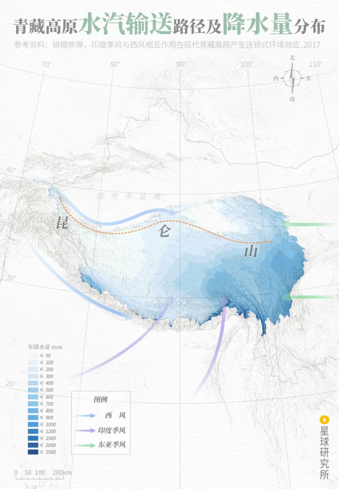 (青藏高原水汽输送的路径以及降水量分布,制图@巩向杰&赵榜/星球研究所)