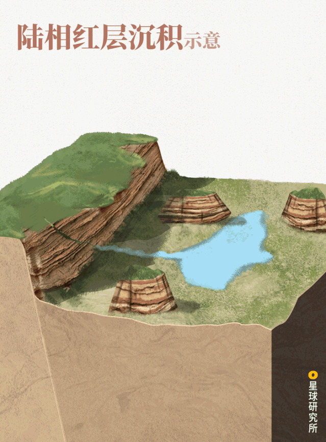 (氧化铁[Fe2O3]即为红色,也是铁锈的主要成分;亦有研究显示红层并非完全由干旱气候导致;陆相红层沉积示意;制图@郑伯容/星球研究所)