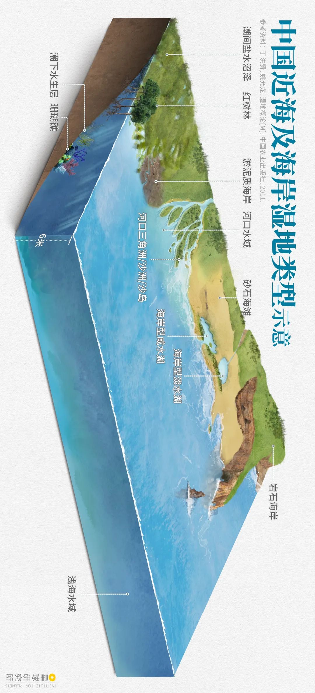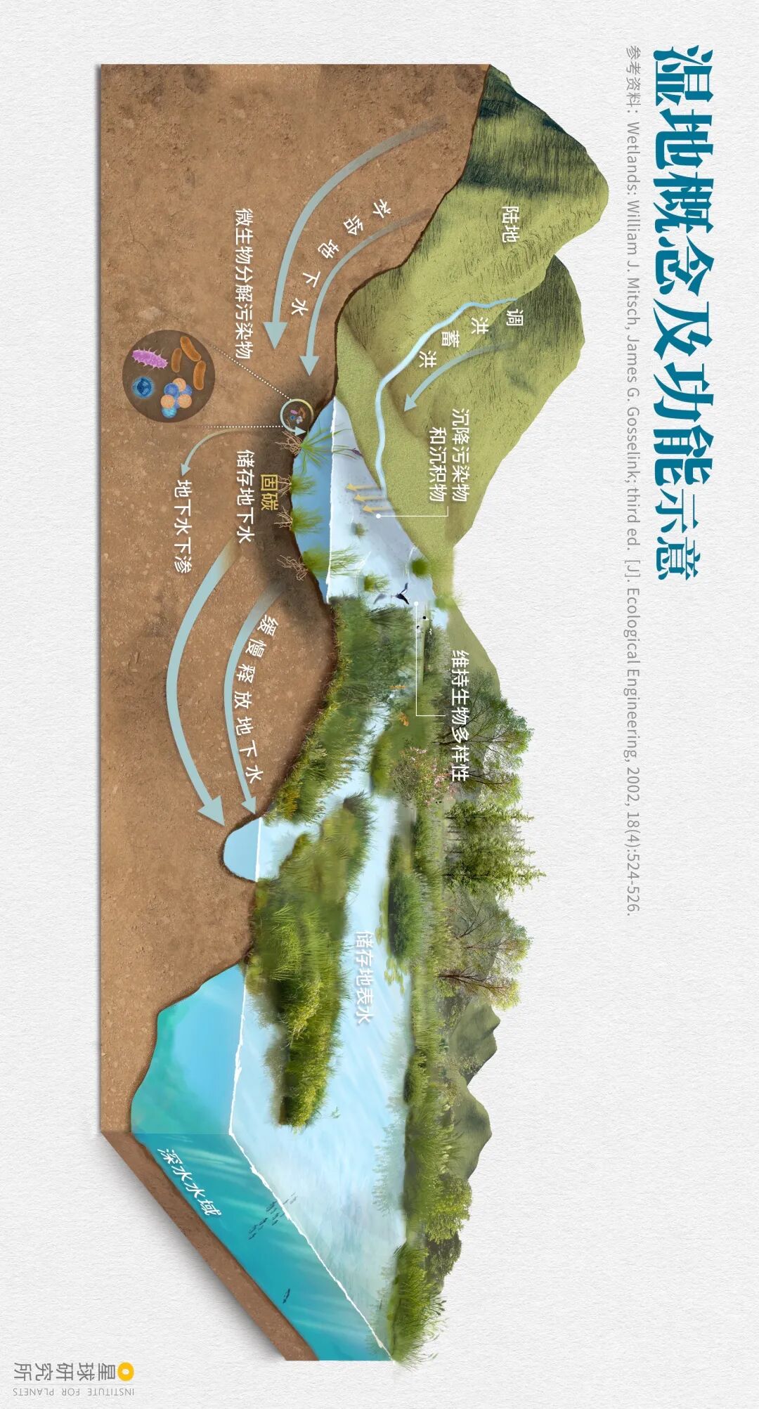(请横屏观看,湿地定义及功能示意,《湿地公约》中将陆地间所有水域及海岸地区定义为湿地,该体系方便管理但过于庞杂,本文所指的湿地主要为陆地及深水水域的过渡地带,制图@王天怡/星球研究所)