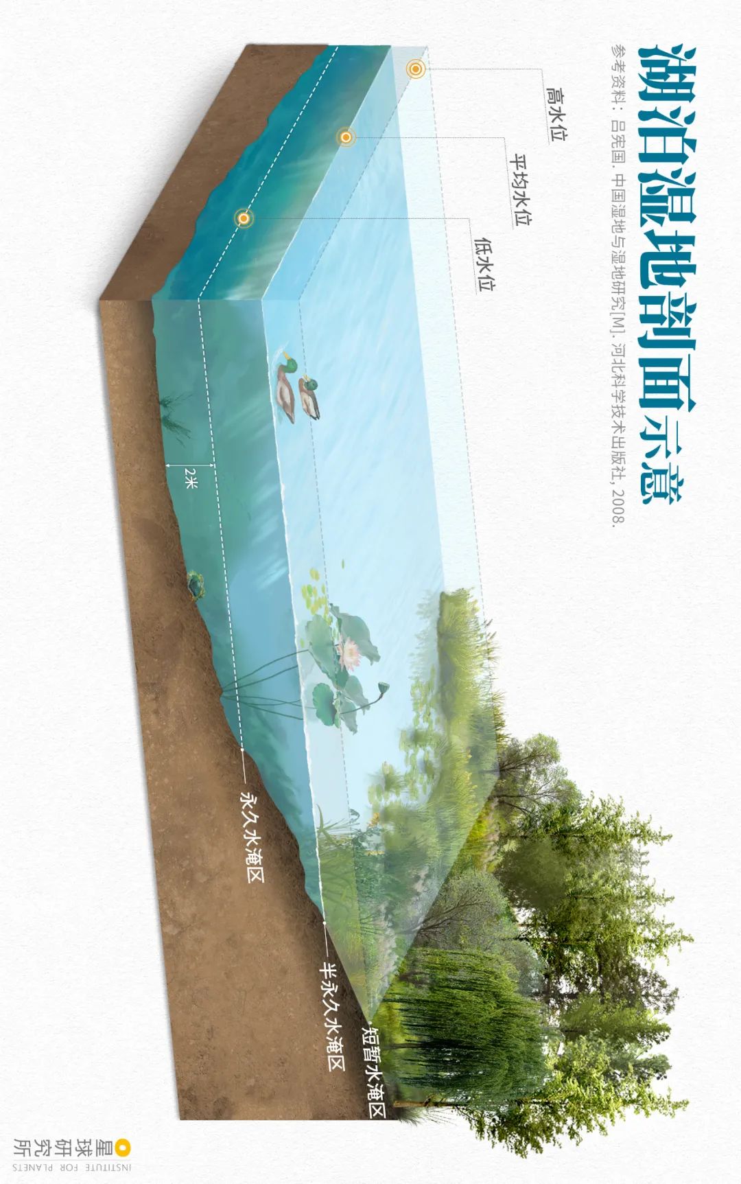 (请横屏观看,湖泊湿地示意图,代表枯水期水深不足2米的湖滨地带,制图@王天怡/星球研究所)