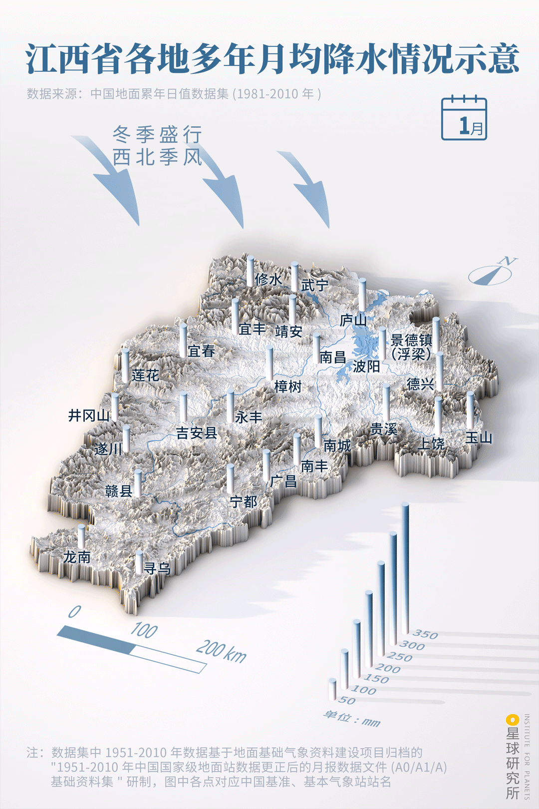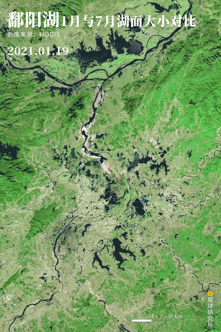 (鄱阳湖1月与7月湖面大小对比,“高水是湖,低水似河”;一般鄱阳湖最低水位在1月,最高水位在7或8月,制图@陈志浩/星球研究所)