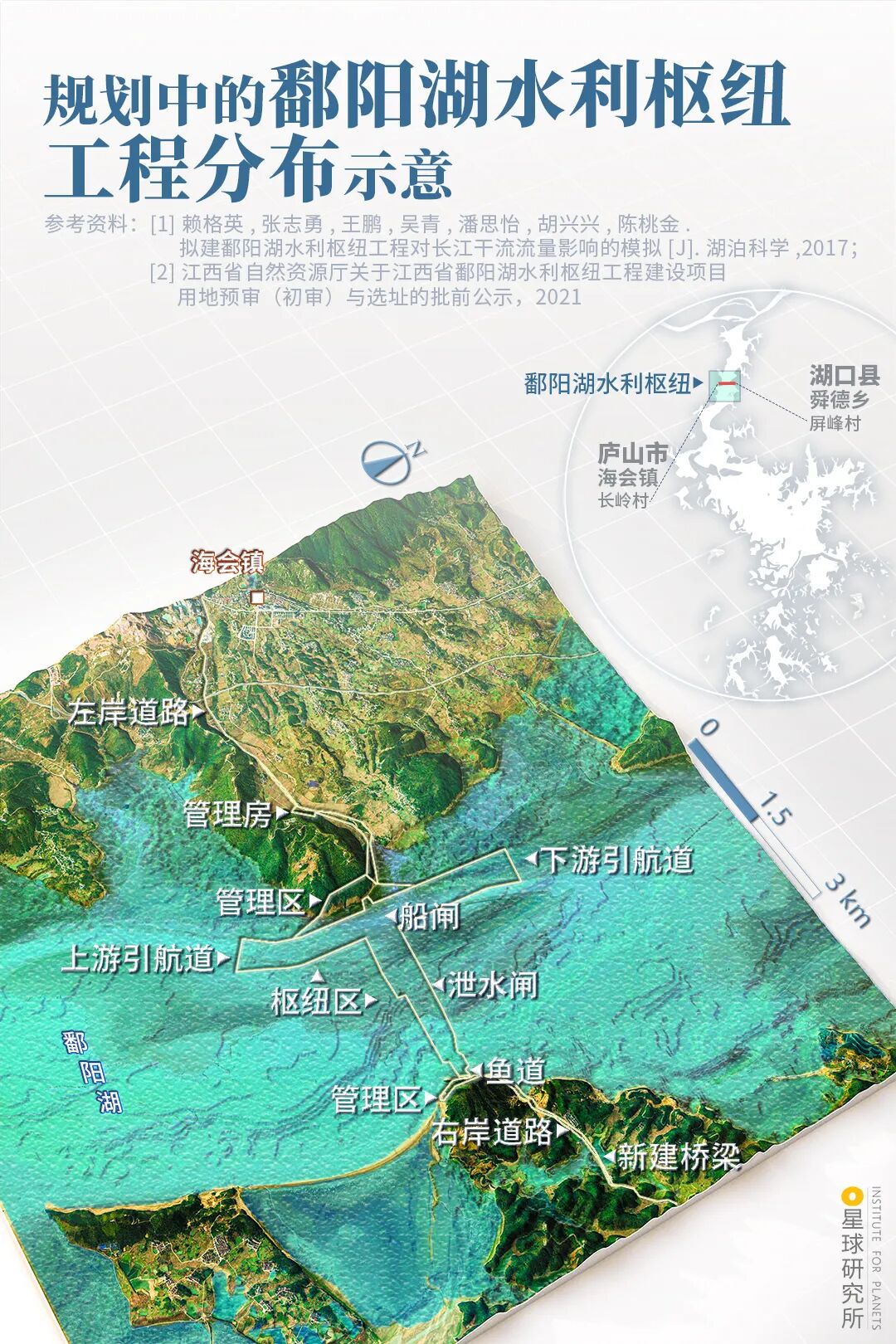 (规划中的鄱阳湖水利枢纽工程分布示意,制图@陈志浩/星球研究所)