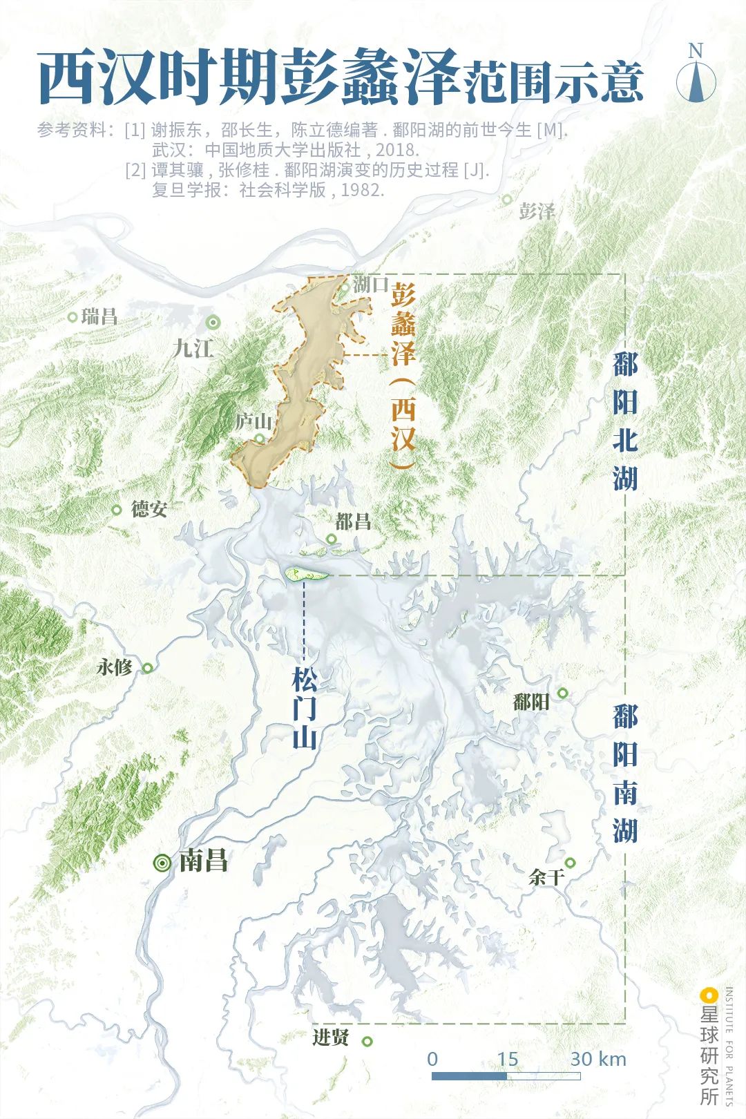 (西汉彭蠡泽范围示意,在这之前彭蠡泽的主体在湖口以北,有观点将其称为彭蠡古泽;本文着重介绍鄱阳湖盆地内的水域形成过程,对湖口以北的水域形态不进行探讨,制图@陈志浩/星球研究所)