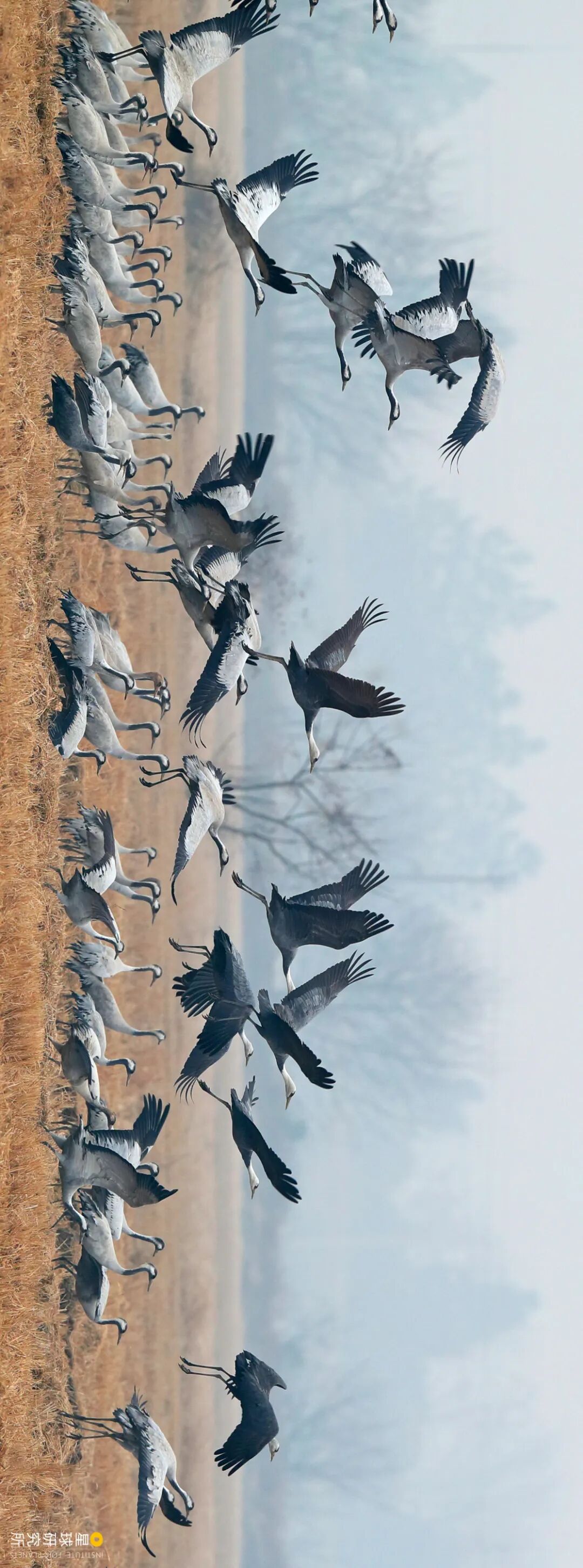(头颈白、身体灰的几只白头鹤混在灰鹤群中,拍摄于南昌新建区,摄影师@刘璐)