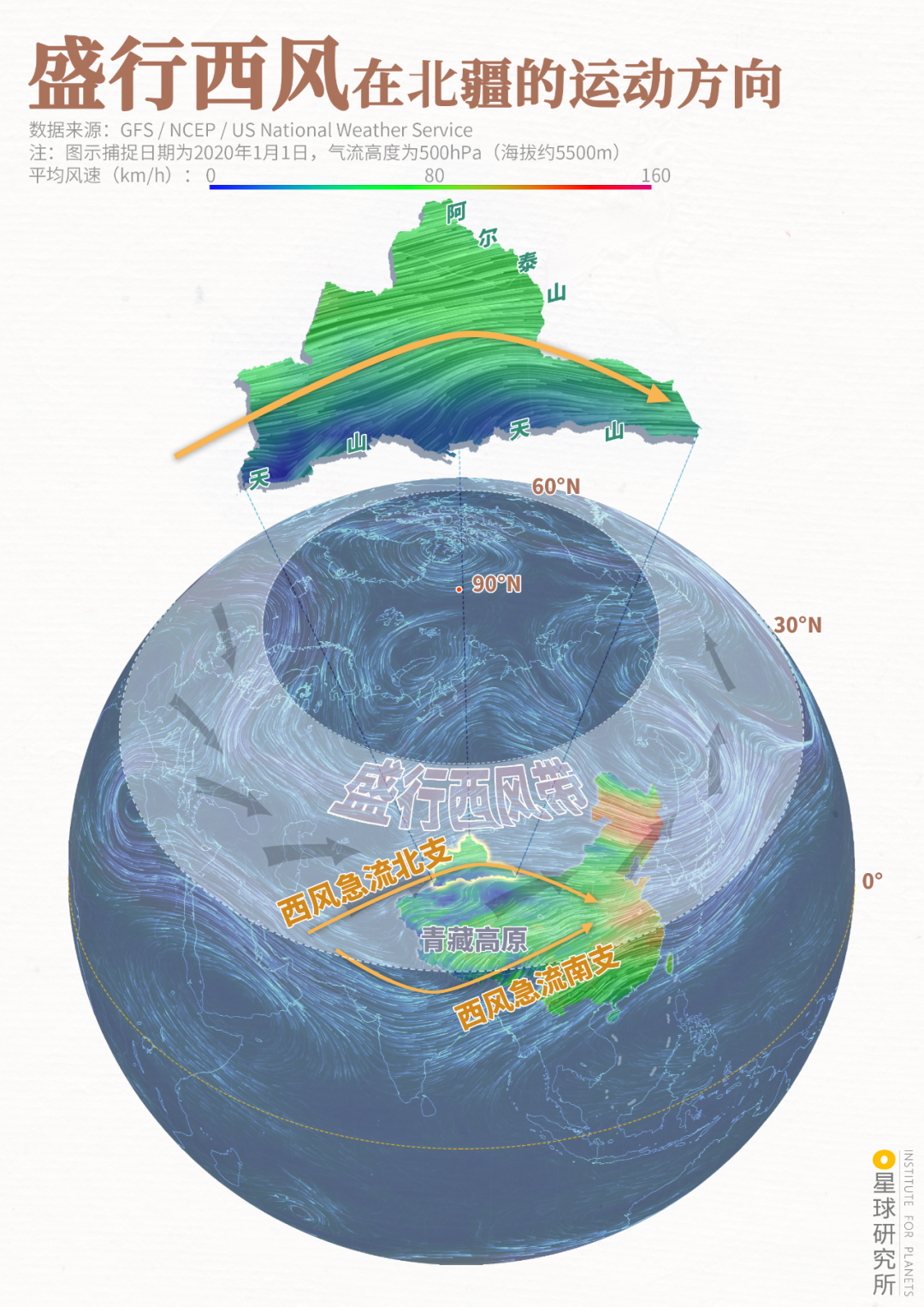 (盛行西风在北疆的运动方向,图中所示为高海拔的风,从山脉间缺口涌入的风海拔较低,制图@陈志浩/星球研究所)