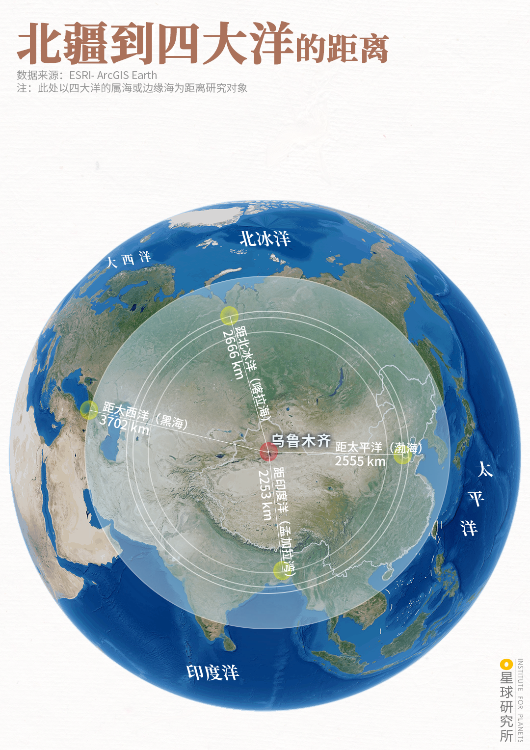 (北疆乌鲁木齐与四大洋的距离,制图@陈志浩/星球研究所)
