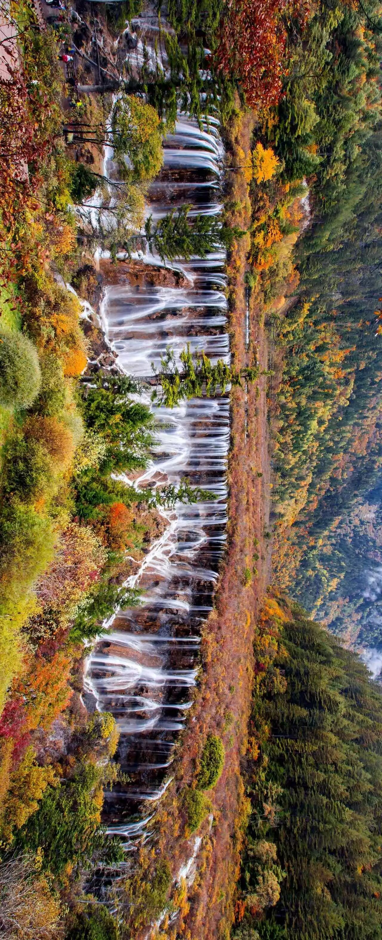 (请将手机横屏观看,航拍为我们提供了一个难得的机会,将瀑布与上方的湖泊一起收入视野;诺日朗上游的诺日朗群海是钙华物质的重要来源,摄影师@魏炜)