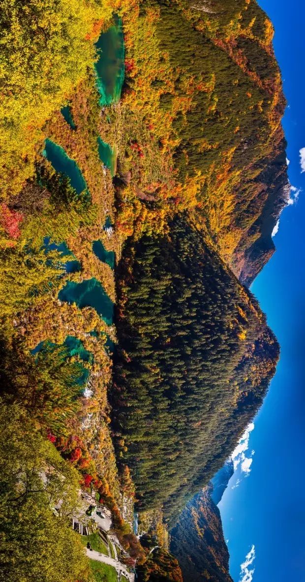 (请将手机横屏观看;摄影师在护林员的向导下,从一户藏民家后院穿插而上,终于找一个极佳的高位,拍下了树正群海的全景;树正群海的形成原因还包括堰塞物堆积、生物加速钙华沉积等;摄影师@曾勇前)
