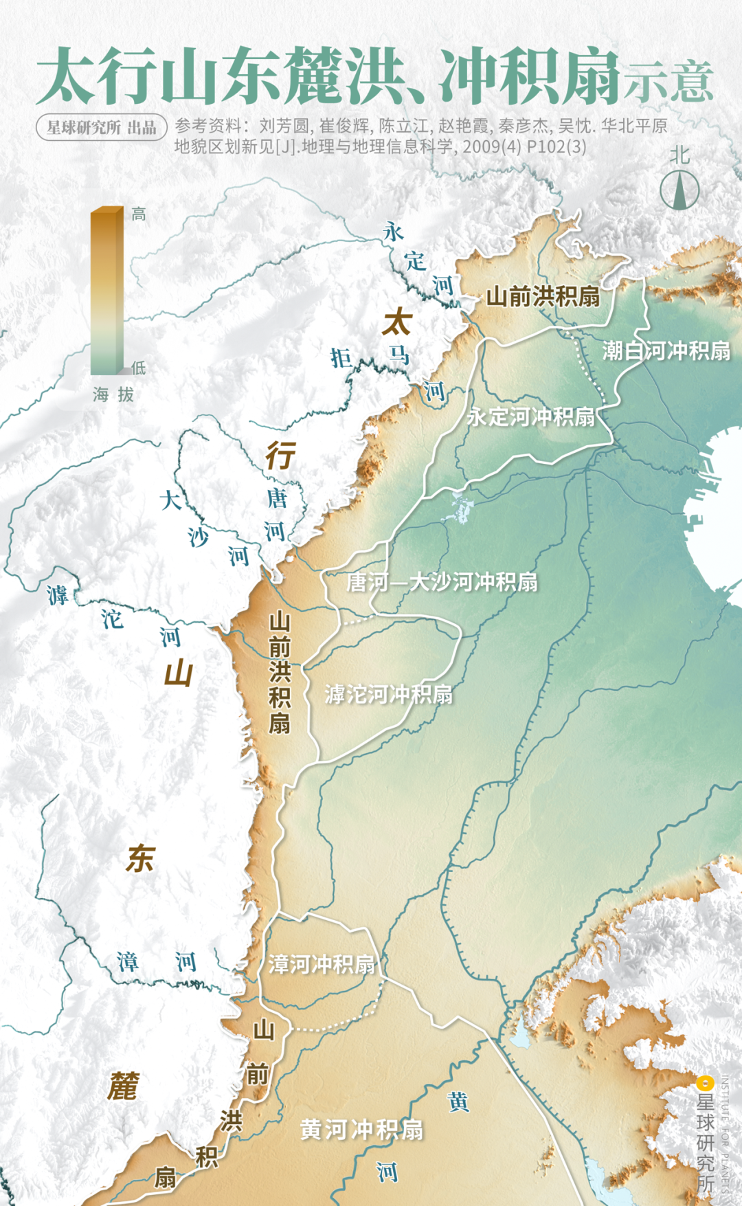 (太行山西侧盆地和支脉位置示意,制图@陈景逸/星球研究所)