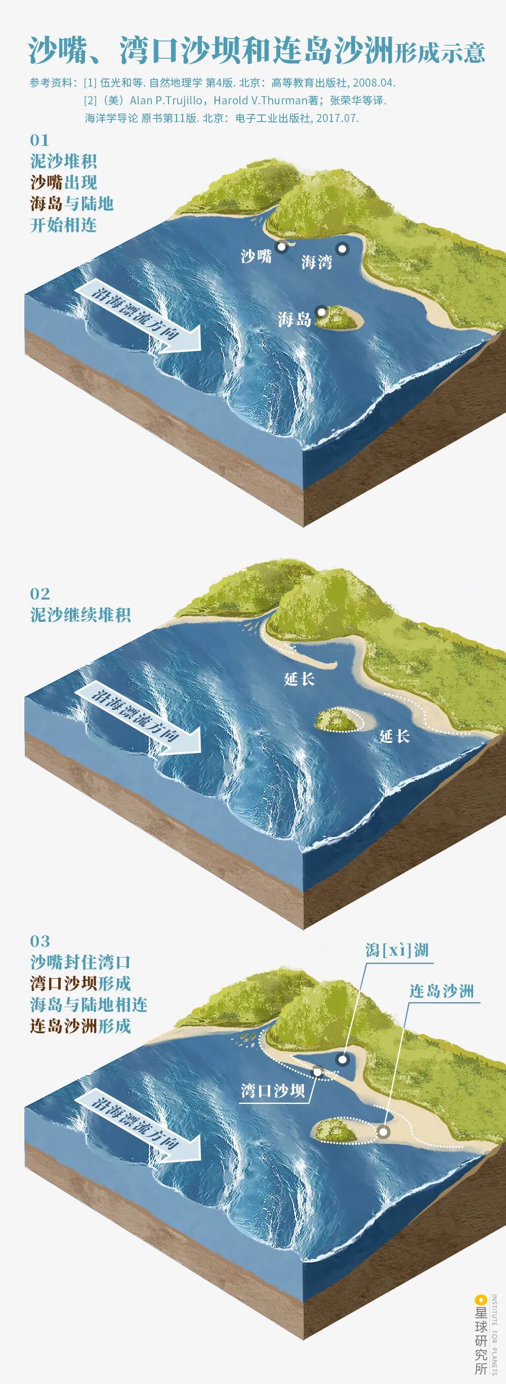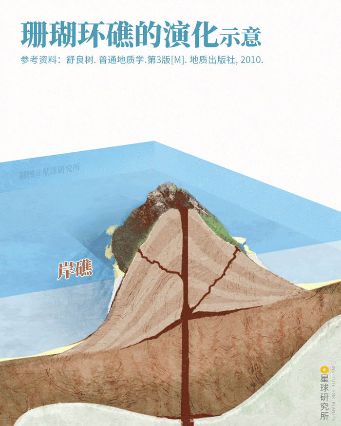 (珊瑚环礁的演化示意图,制图@郑伯容/星球研究所)