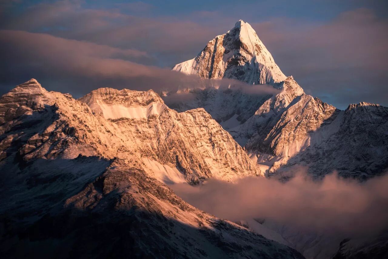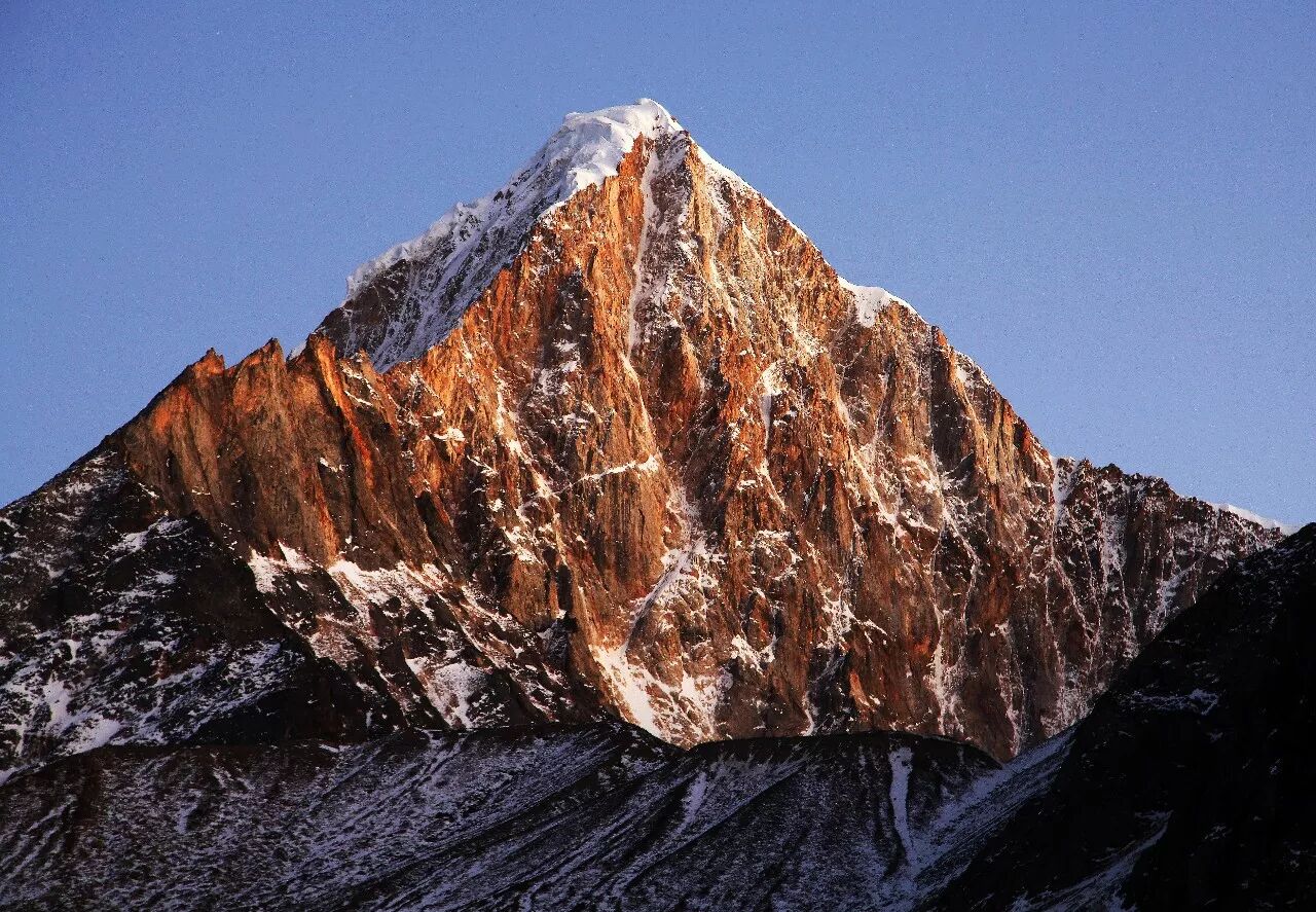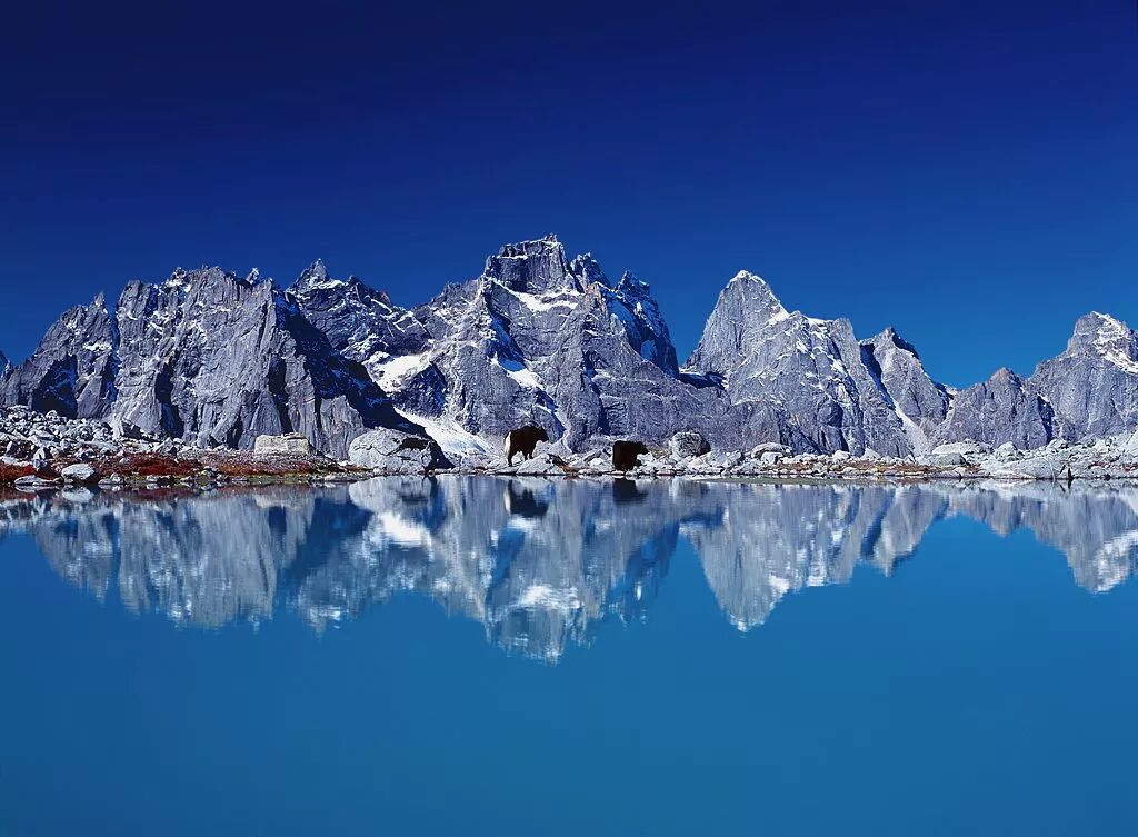 (在海拔4500米的羊满台海子拍摄的倒沟山群峰,最高处海拔5466米,两者相差约1000米,而这1000米的顶峰正好展现了岩峰千万变化的精华;摄影师@大川健三)