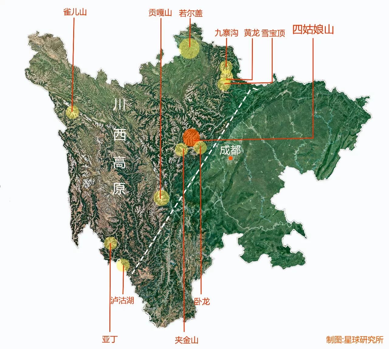 (川西高原主要景点分布图,白色虚线为川西高原的大致东界,星球研究所制作)