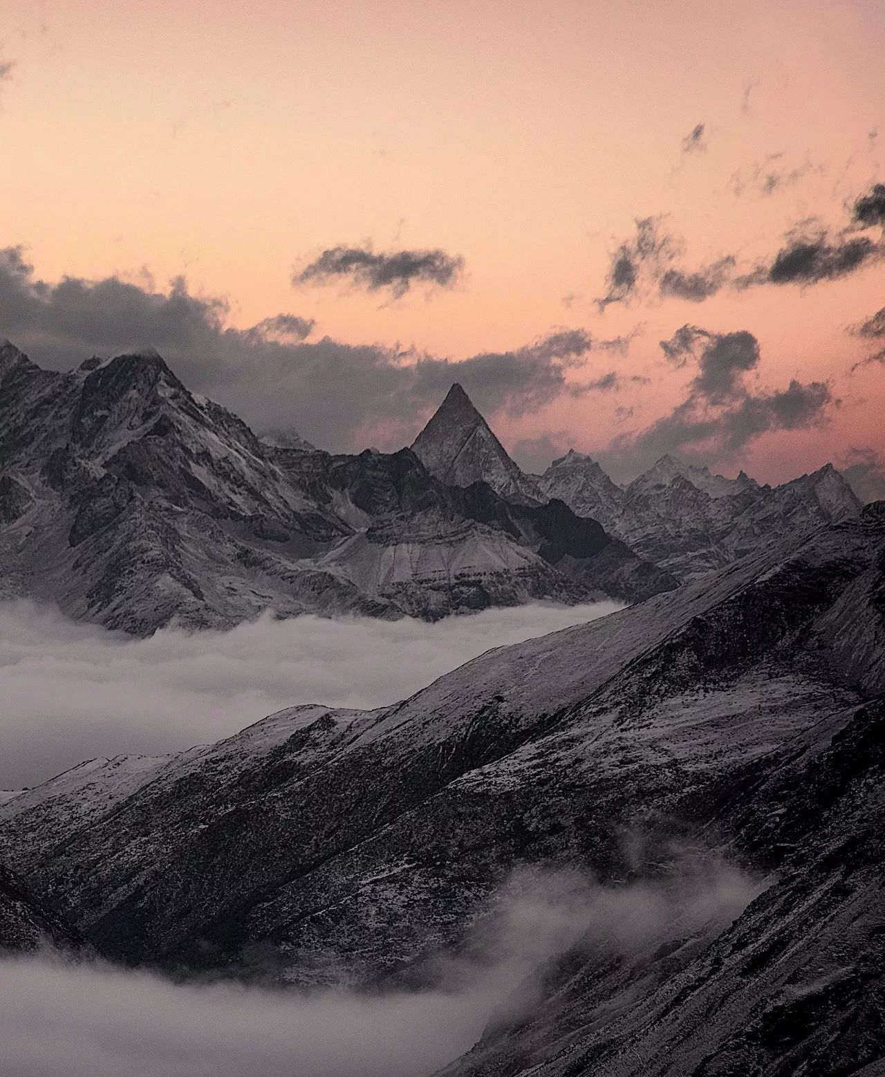 (清晨,四姑娘山主峰幺妹峰披上了粉色轻纱,摄影师@7556米)