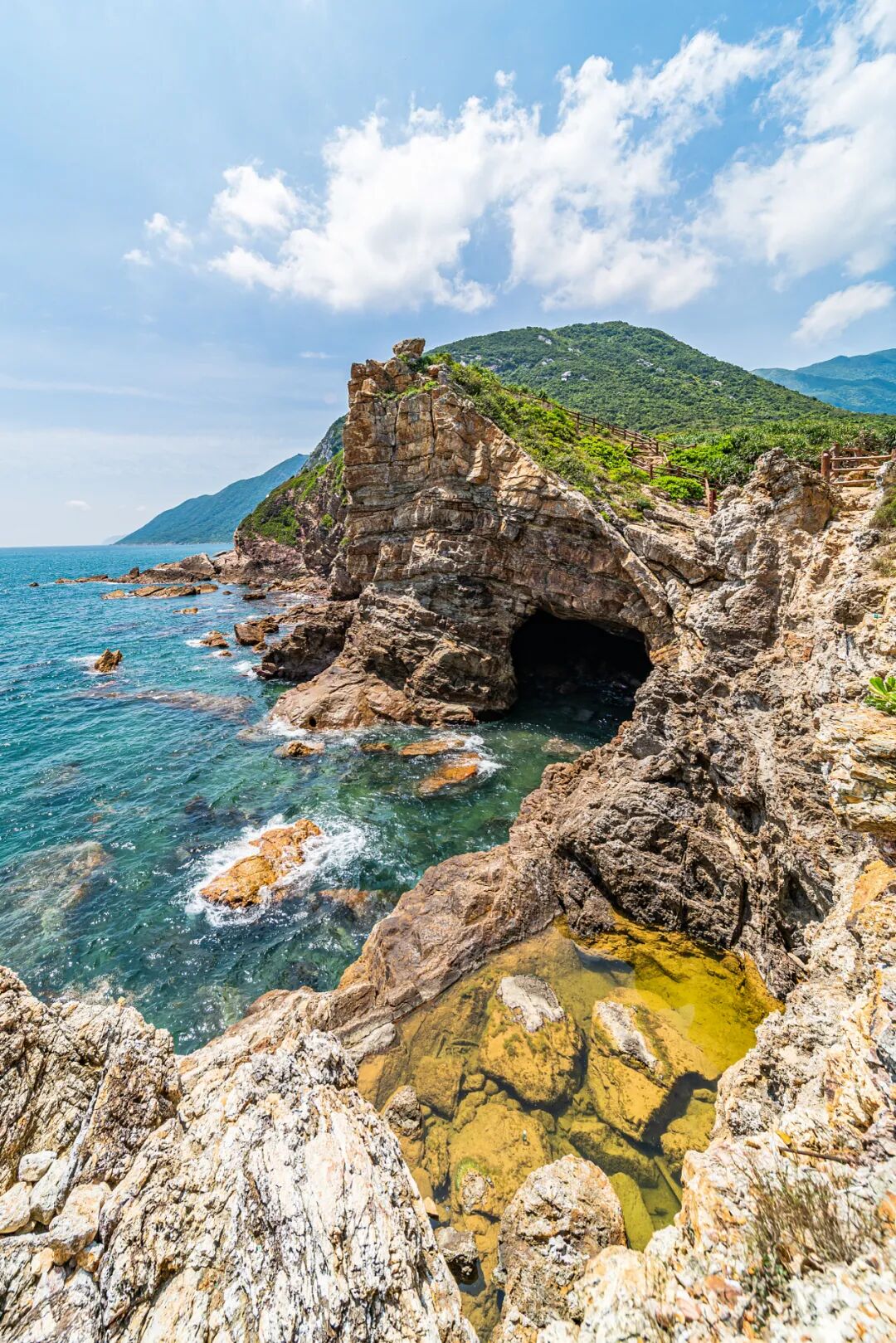 (深圳杨梅坑鹿嘴山庄附近的基岩海岸,分布有数个海蚀洞穴,来源@视觉中国)
