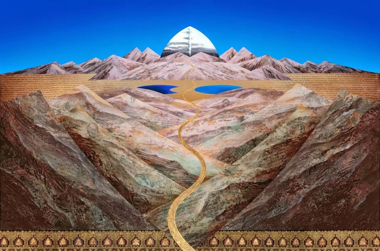 (艺术家绘制的神山、圣湖、母亲河信仰图,中间湖泊为玛旁雍错和拉昂错,绘图@Socrates Geens)
