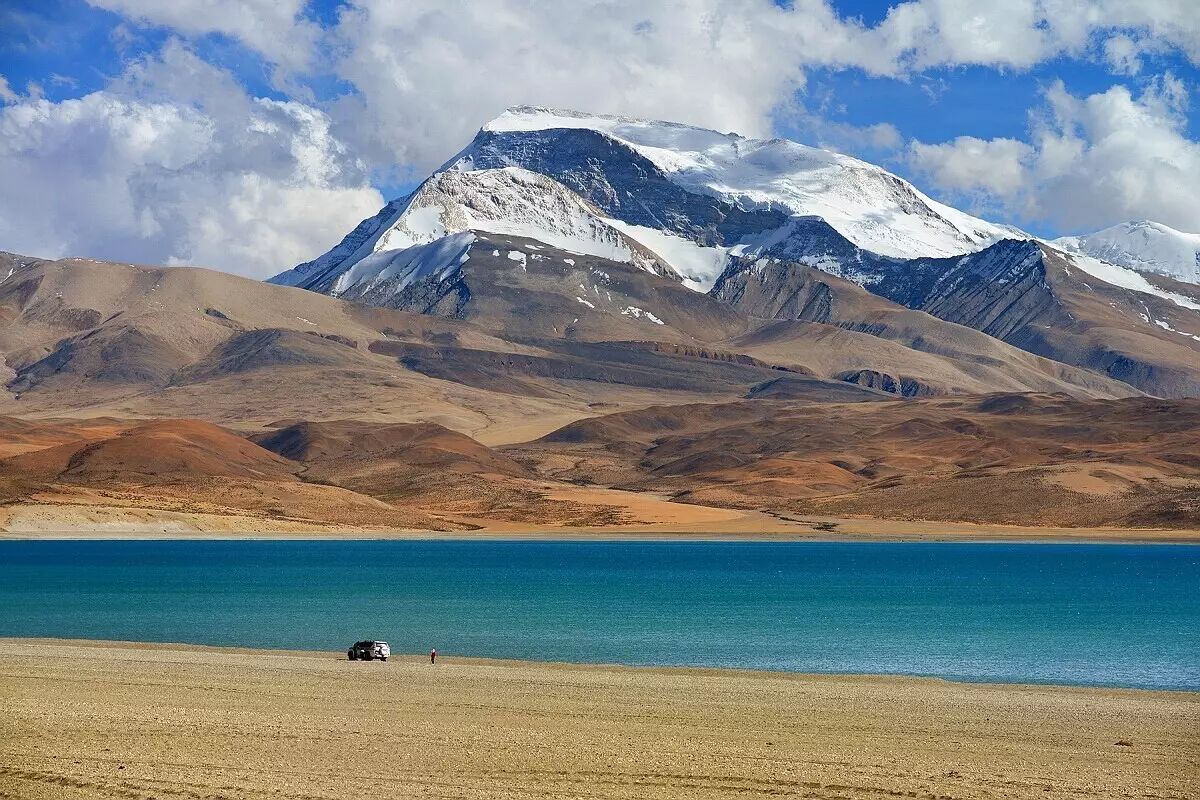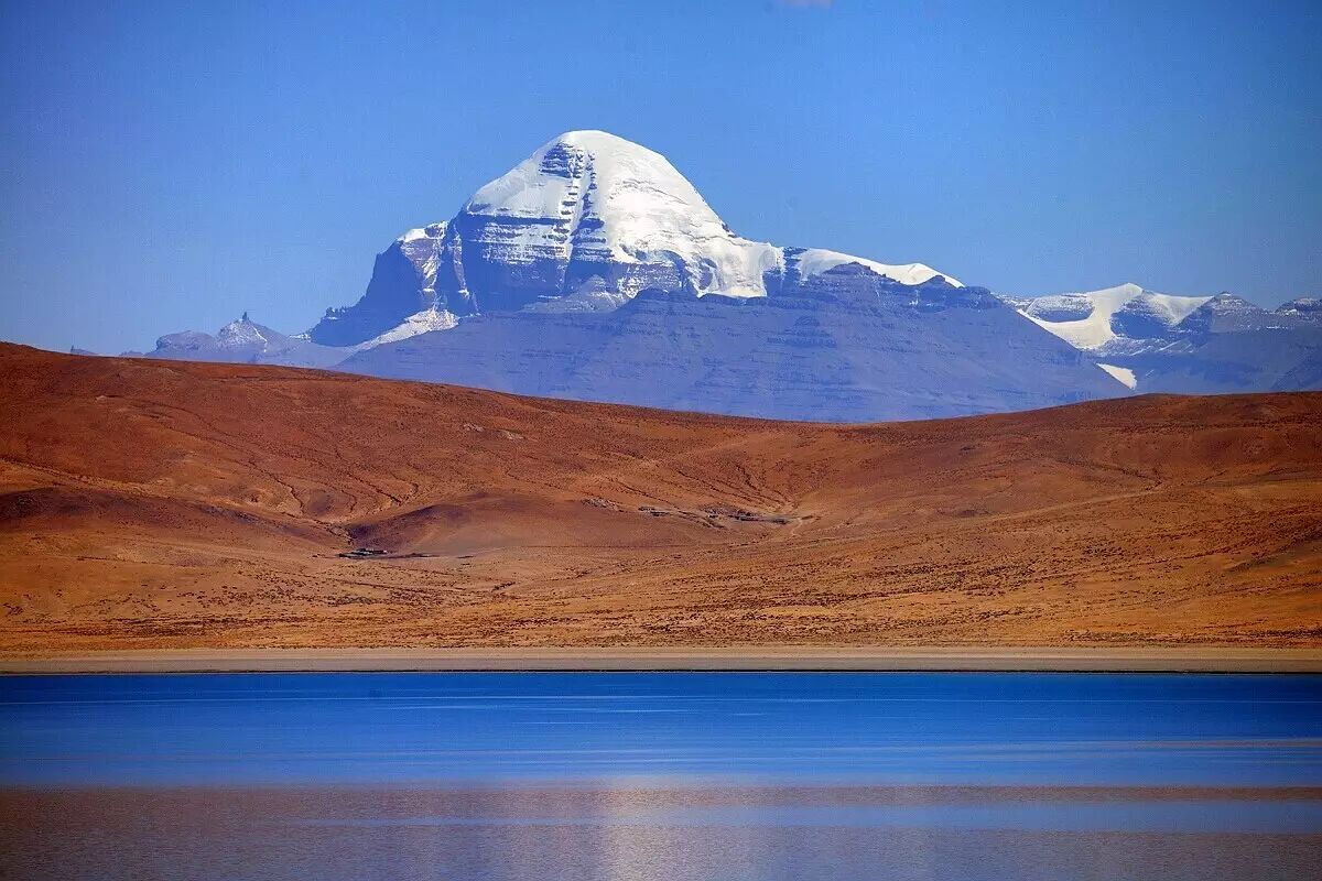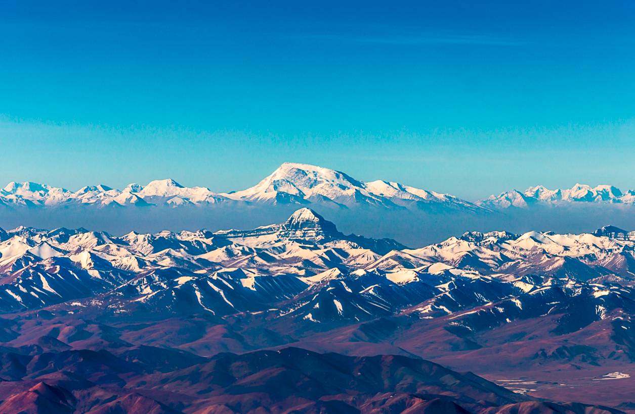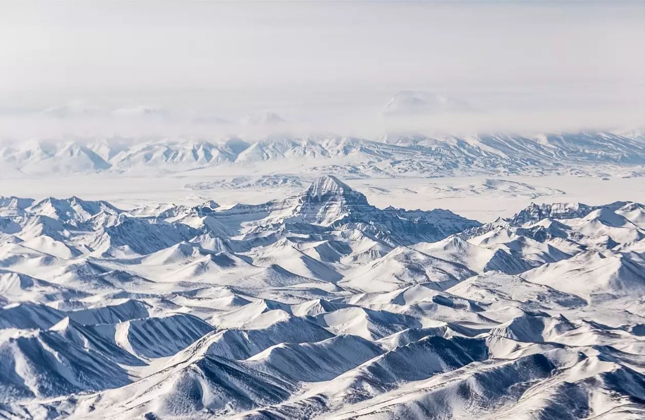 (航拍图,中间为冈仁波齐,远方云雾之中为纳木那尼峰,摄影师@老土豹孙岩)