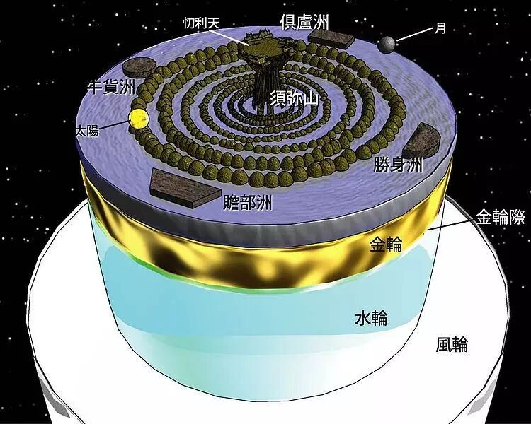 (佛教的世界观:须弥山与四大部洲,绘图@Wikiwikiyarou)