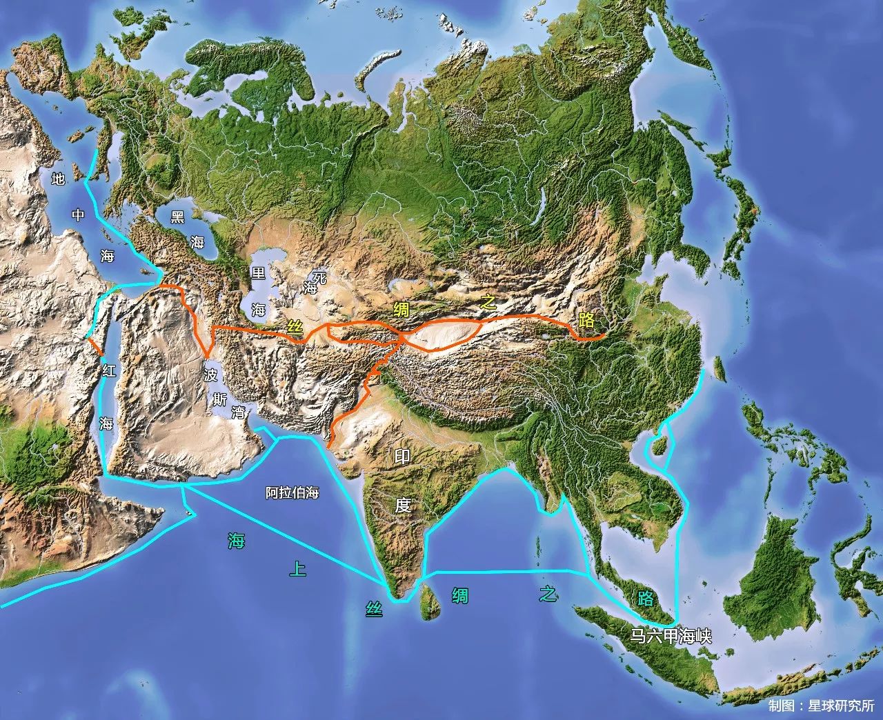 (丝绸之路海路与陆路图,制图@风沉郁/星球研究所,底图源自@Michael Schmeling)