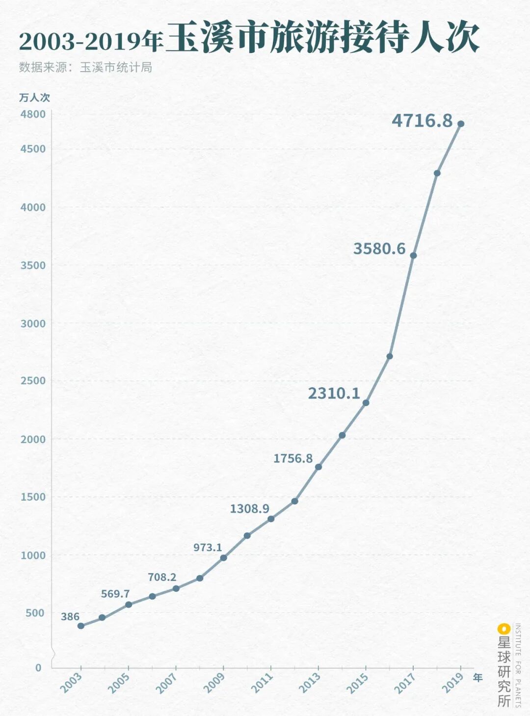 (2003-2019年玉溪市旅游接待人次变化,制图@王申雯/星球研究所)