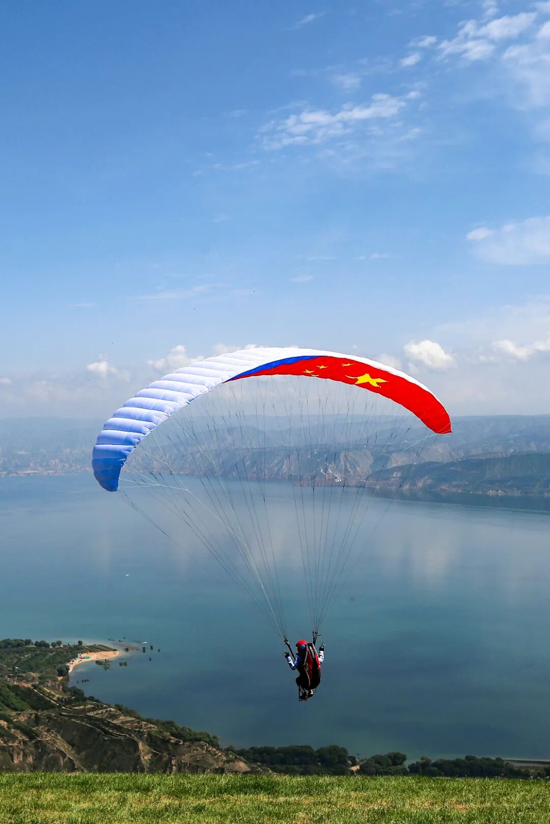(临夏依靠自然环境优势,发展了滑翔、滑雪、桨板等多种体育观光业态,图为一名滑翔者朝着刘家峡水库翱翔,图片来源@视觉中国)