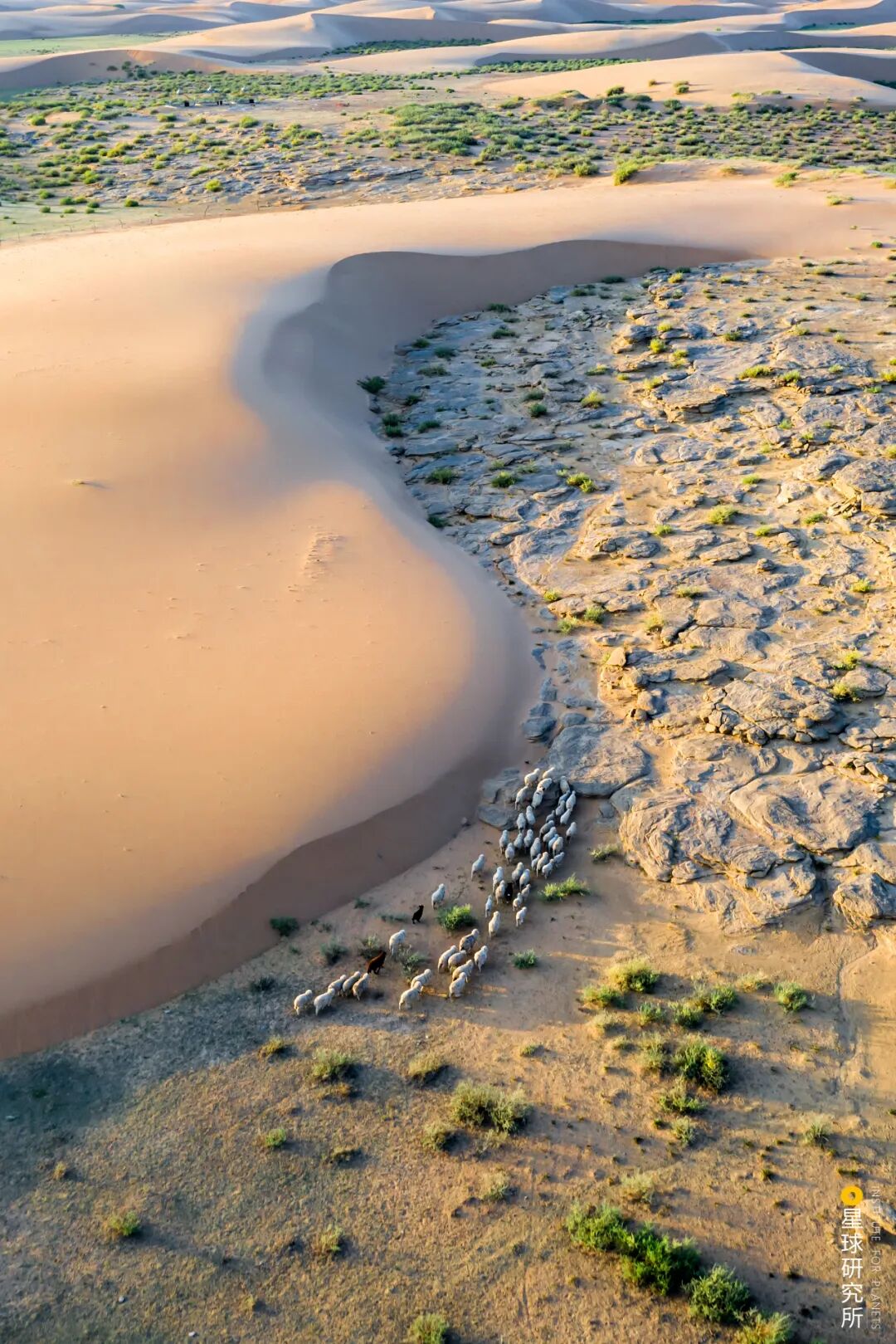 (请横屏观看,光伏治沙与未治理的土地对比,摄影师@苏大)