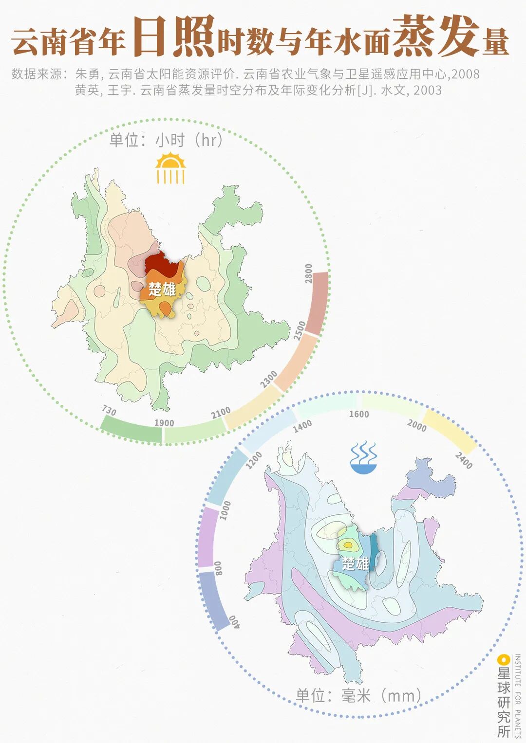 (云南省年日照时数与年水面蒸发量,制图@陈志浩/星球研究所)