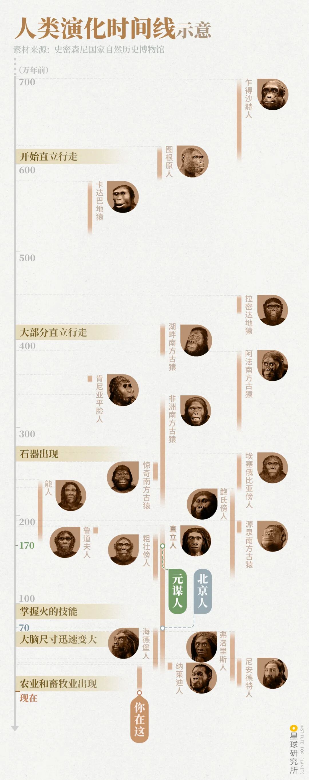 (出自人教版《中国历史·七年级上册》,下图为人类演化时间线以及元谋人在其中的位置,距今约170万年的元谋人,是我国最早的古人类代表,也是东亚或欧亚大陆最早的直立人之一,制图@郑伯容/星球研究所)