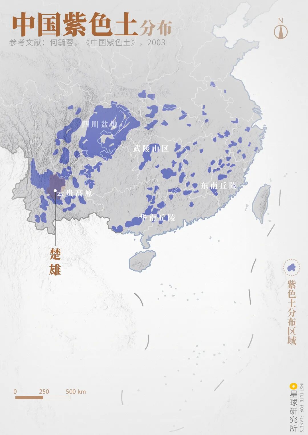 (中国紫色土分布,楚雄是云南紫色土主要分布区之一,制图@陈志浩/星球研究所)