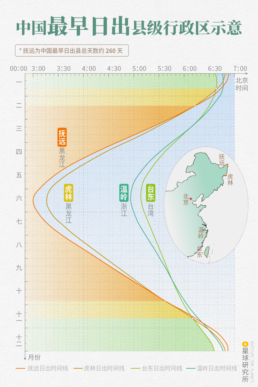 (中国最早日出县级行政区示意,制图@龙雁翎/星球研究所)