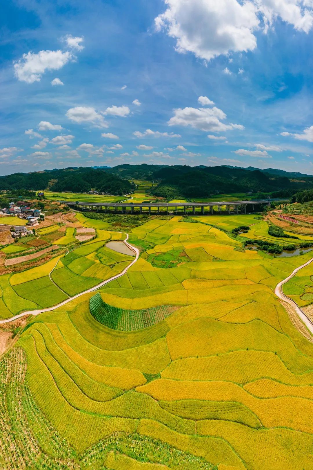 (四周高、中部低的小型盆地,遵义地方俗称为“坝子”。下图为遵义凤冈县长碛古寨的水稻已然成熟,摄影师@罗星汉)