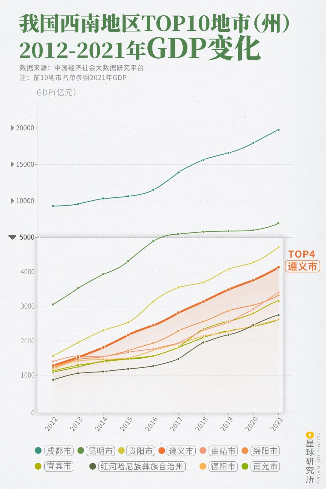 (我国西南地区TOP10地市近十年GDP变化,制图@刘志鹏/星球研究所)