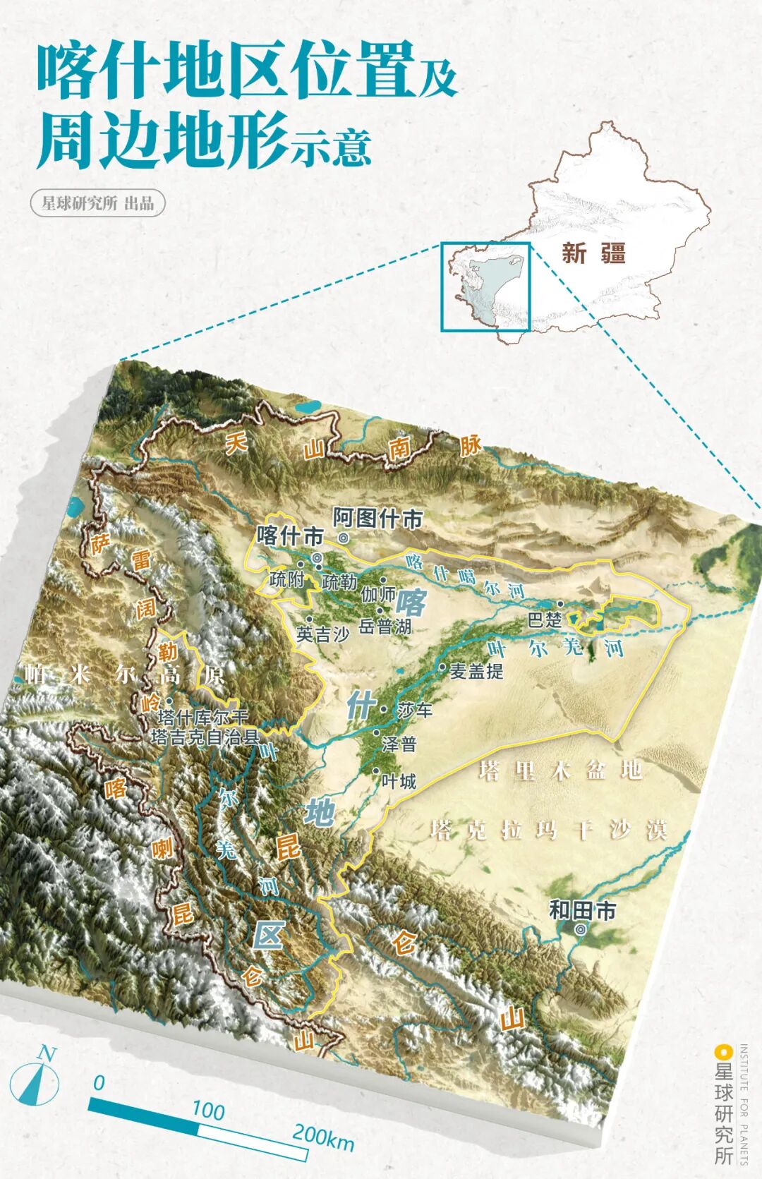 (喀什地区位置及周边地形示意,制图@高俪倩/星球研究所)