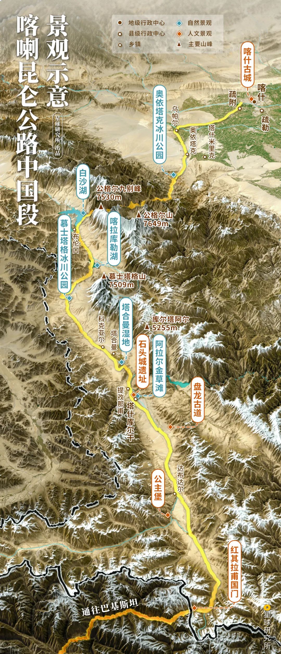 (喀喇昆仑公路中国段景观示意,制图@陈景逸/星球研究所)