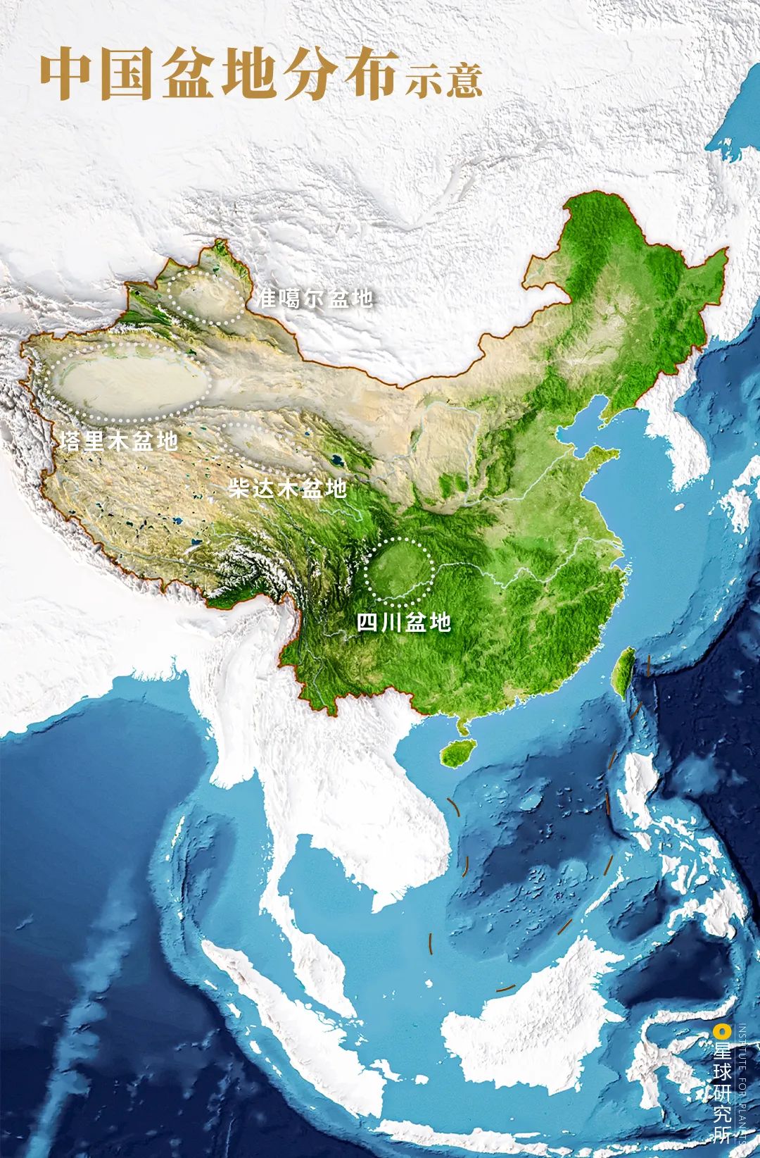 (四川地形示意,为显示四川盆地完整性,对重庆部分做了浅着色处理;制图@陈志浩/星球研究所)