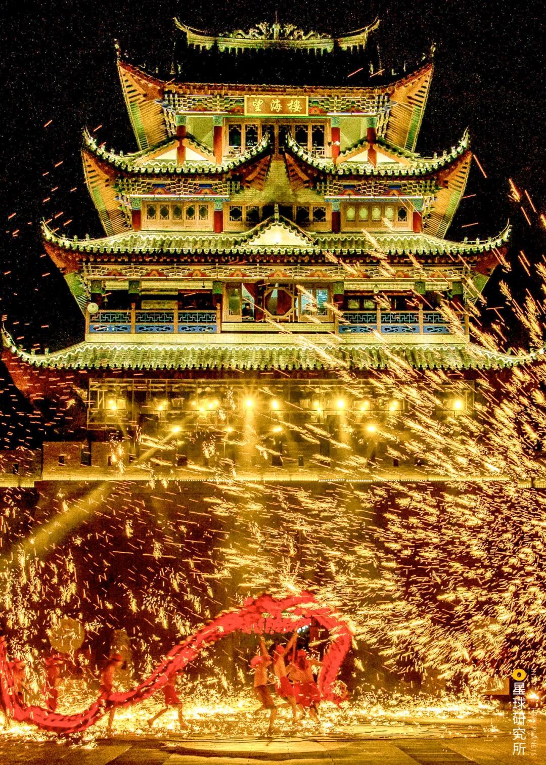 (2013年动工建设的海坛古城旅游景区内,人们在望海楼下表演传统的舞龙,海峡两岸文化同根同源,有着相同的传统活动,摄影师@胡康强)