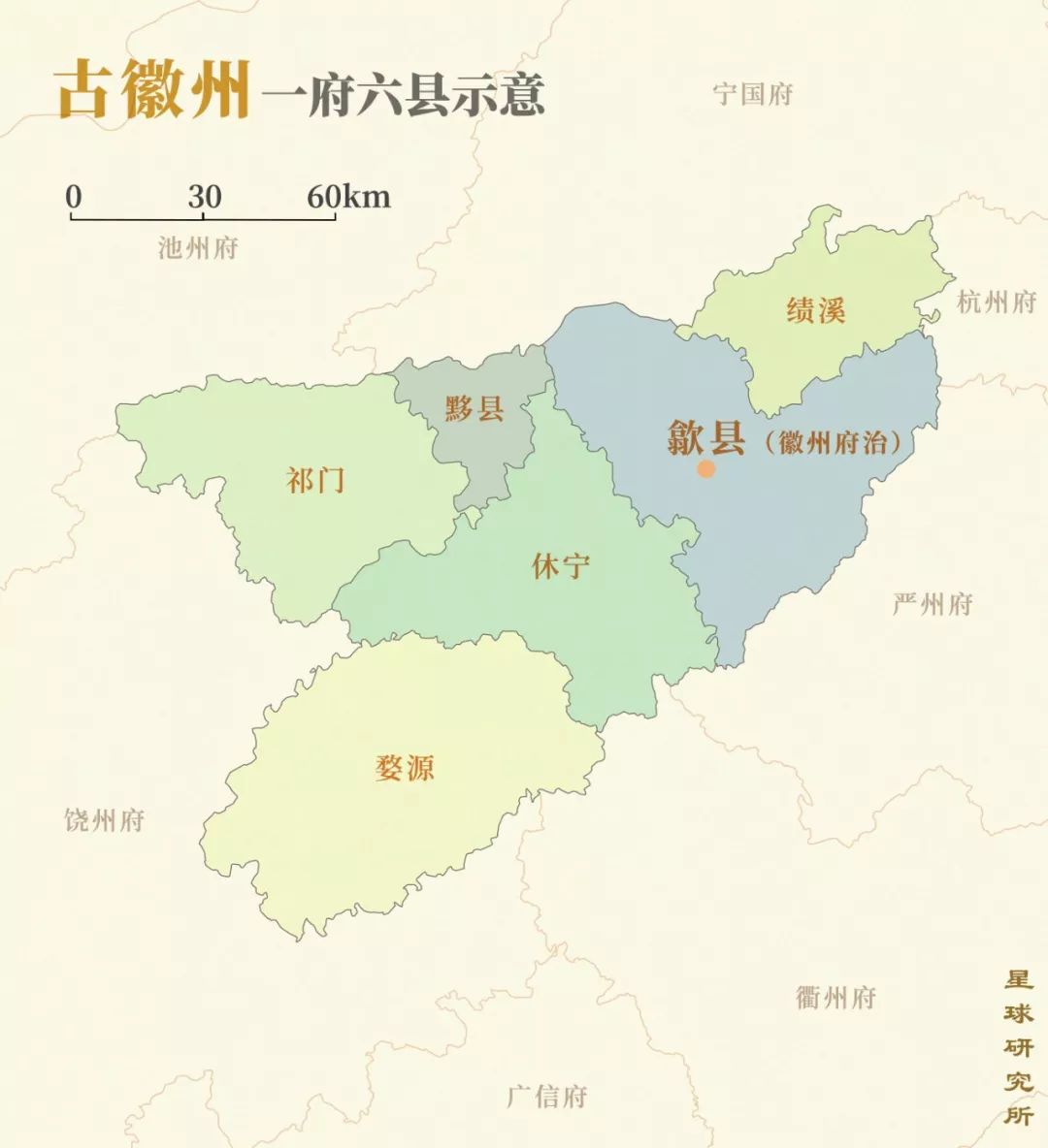 ▼安徽省命名于清康熙时期,“安”为安庆府,“徽”为徽州府,下图为古徽州府位置,制图@张靖&巩向杰/星球研究所