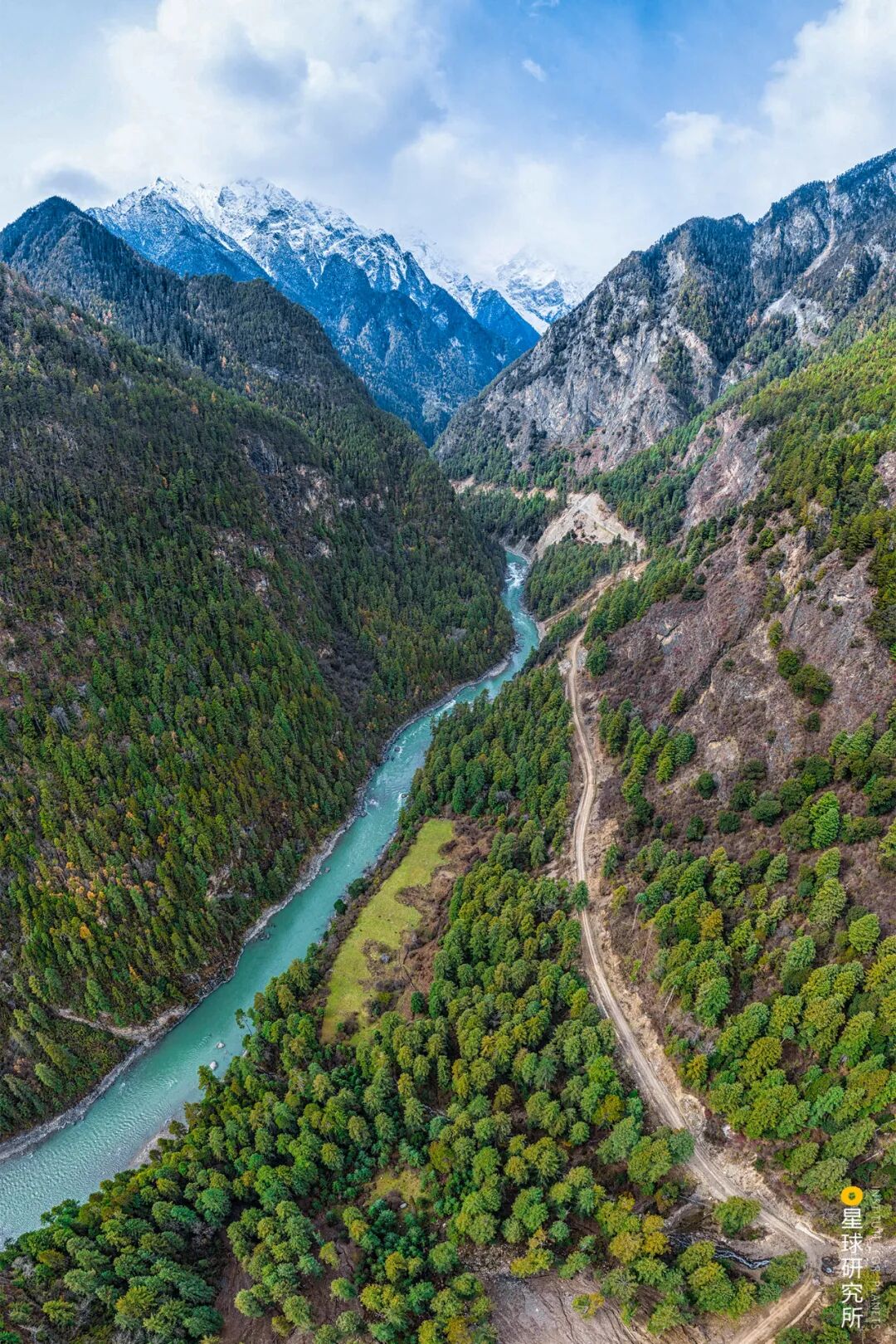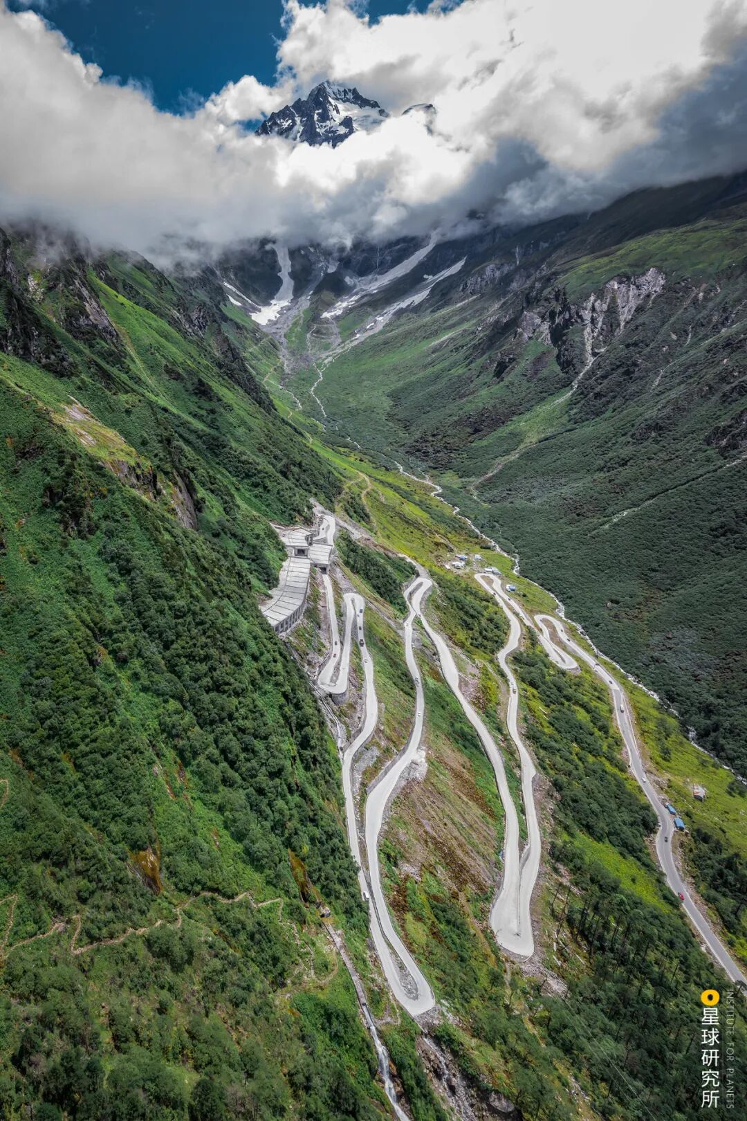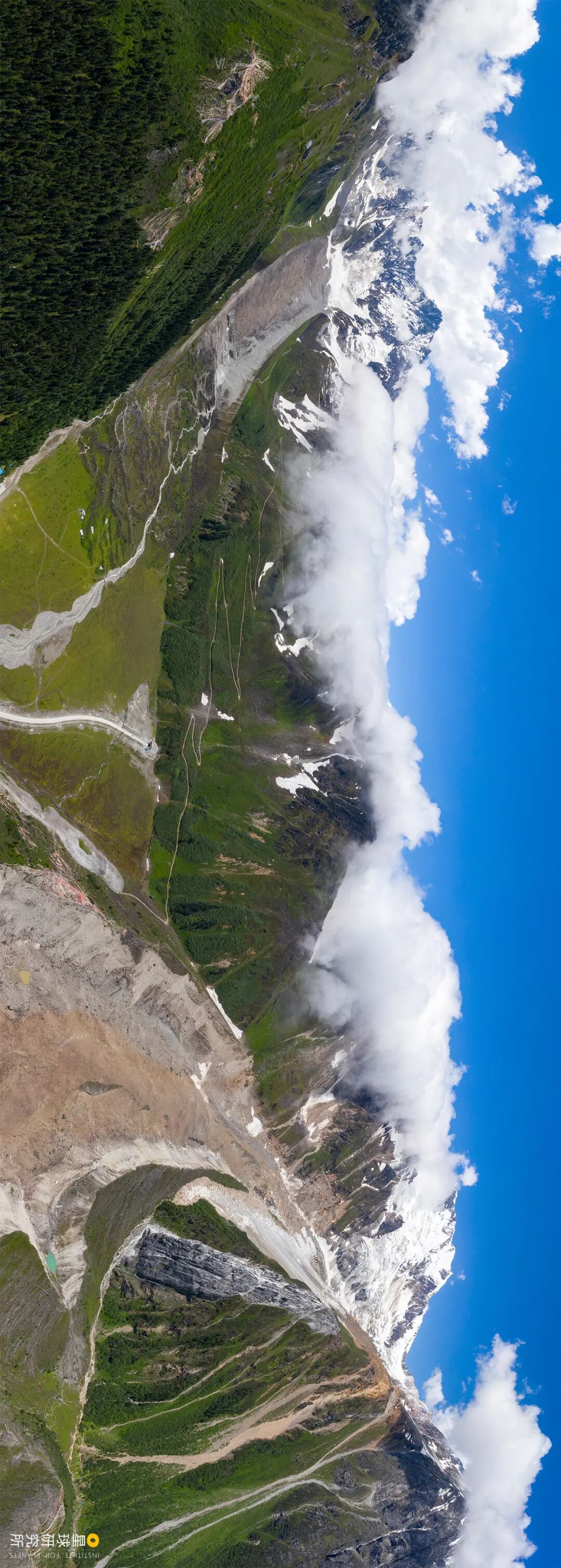 (请横屏观看,图片最下方被两条冰川包围的嘎隆拉隧道,而隧道上方则是墨脱公路的老路,摄影师@邹滔)