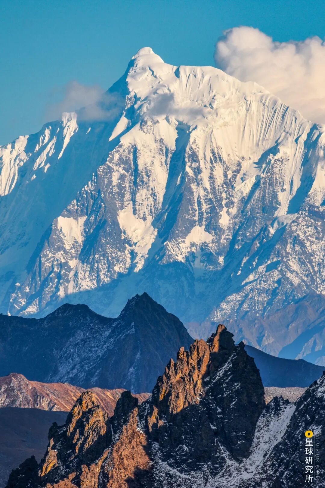 (请横屏观看下图,前景为加拉白垒峰,后方为南迦巴瓦,目前加拉白垒峰的山脉归属尚有争议,也有观点认为在地质构造上,它与喜马拉雅山脉是一体的,摄影师@笨小航)
