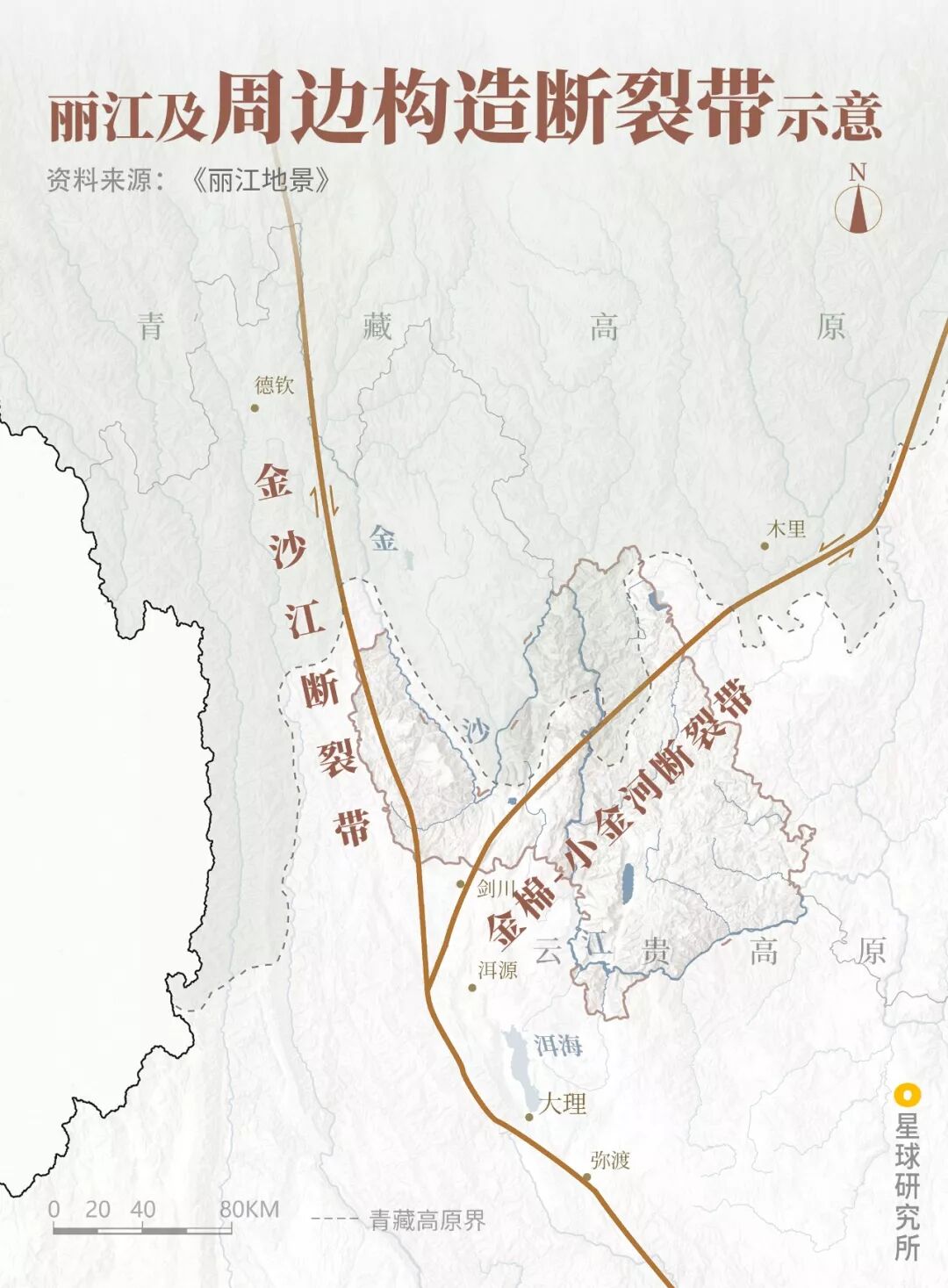 (丽江及周边构造断裂带示意,制图@郑伯容&陈思琦/星球研究所)