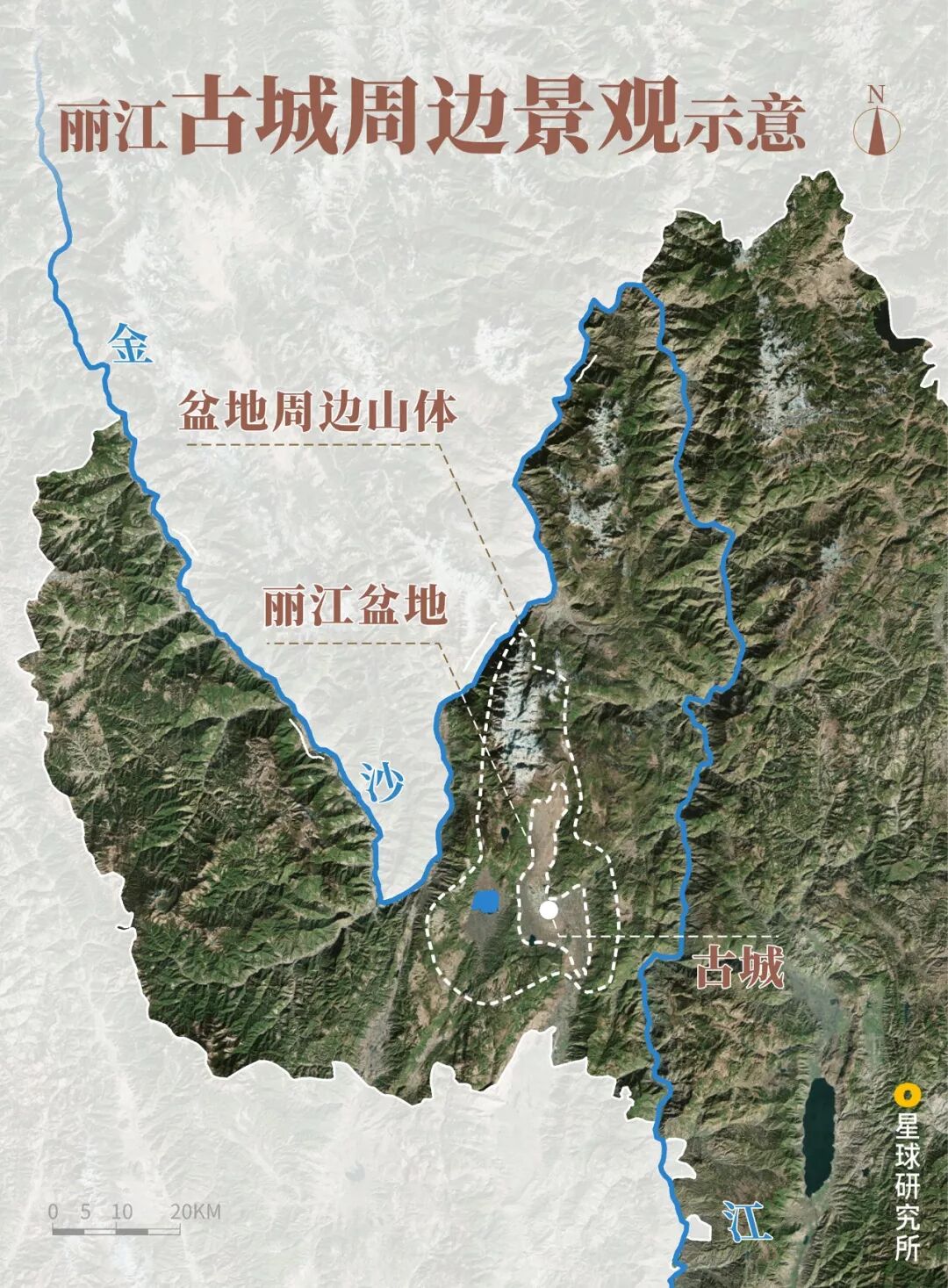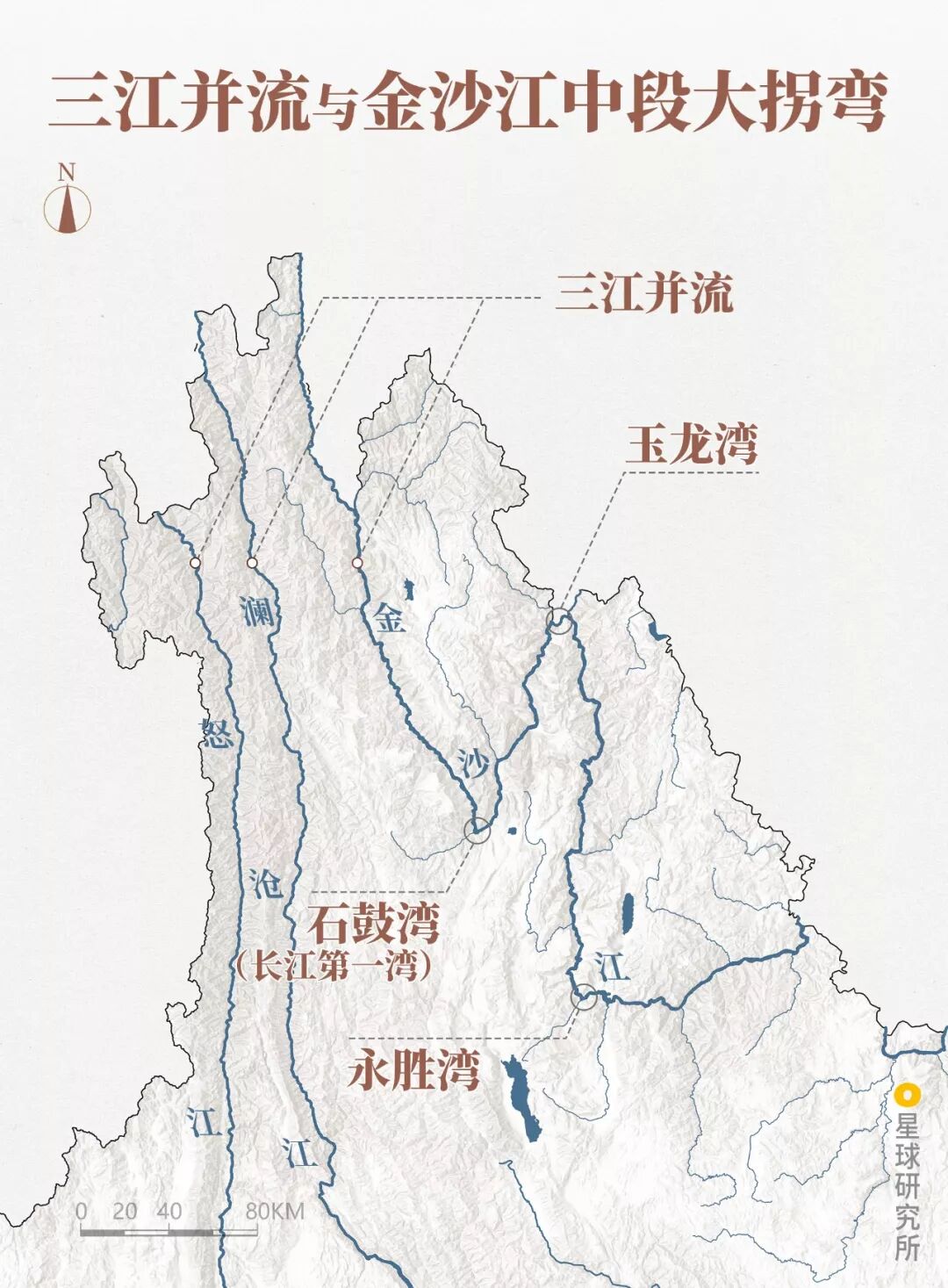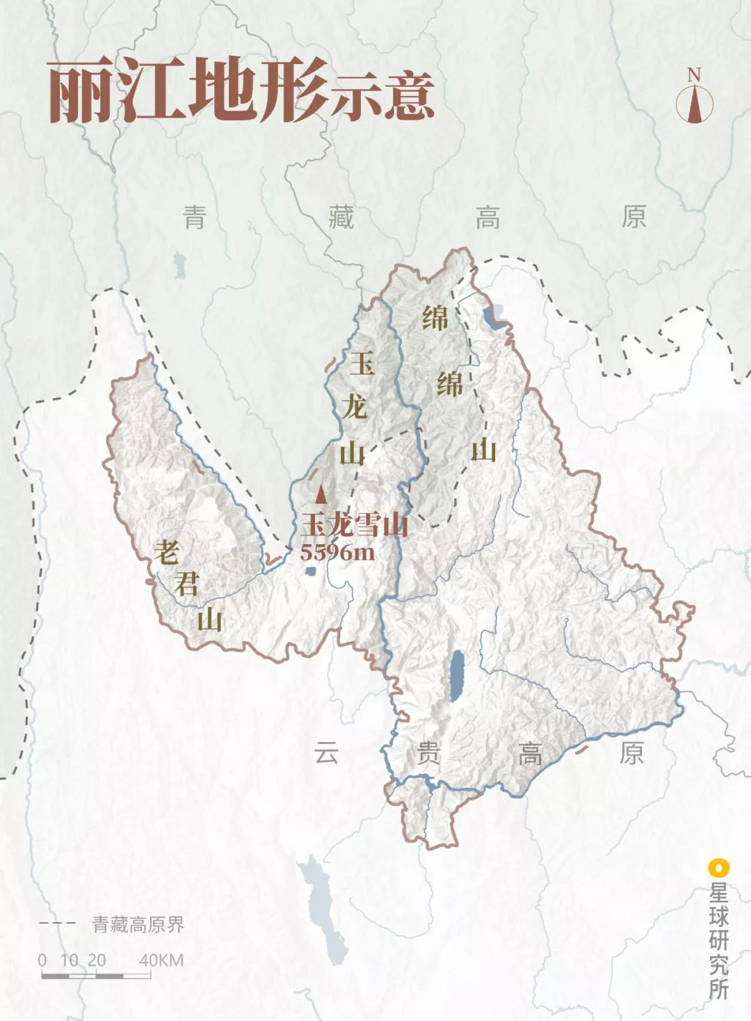 (丽江地形,三列山脉均属于广义横断山脉的一部分,制图@郑伯容&陈思琦/星球研究所)