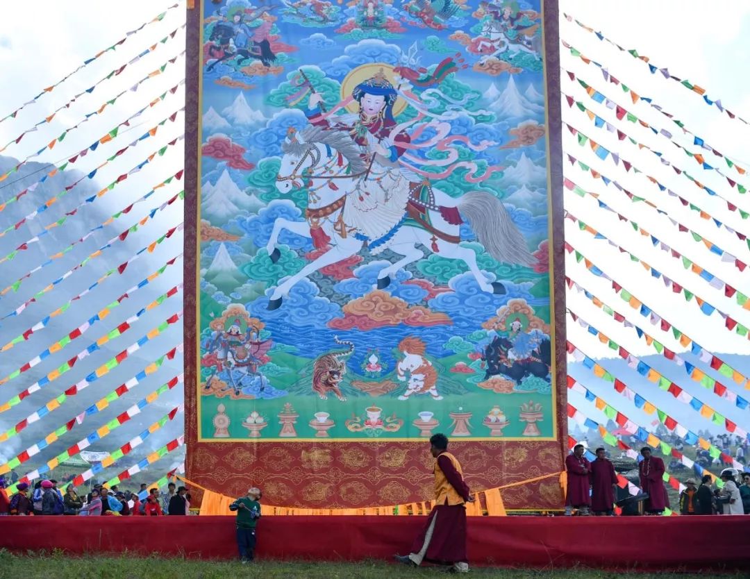 (丽江摩梭人“转山节”,一幅高16米的巨幅唐卡亮相现场,图片源自@VCG)