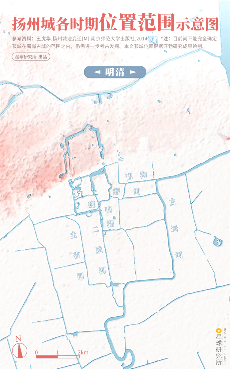 (扬州城各时期位置范围示意图,制图@阿土&俊/星球研究所)