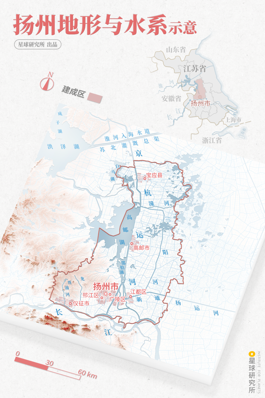 (上文引自杨广《泛龙舟》,下图为扬州地形与水系示意图,制图@俊/星球研究所)