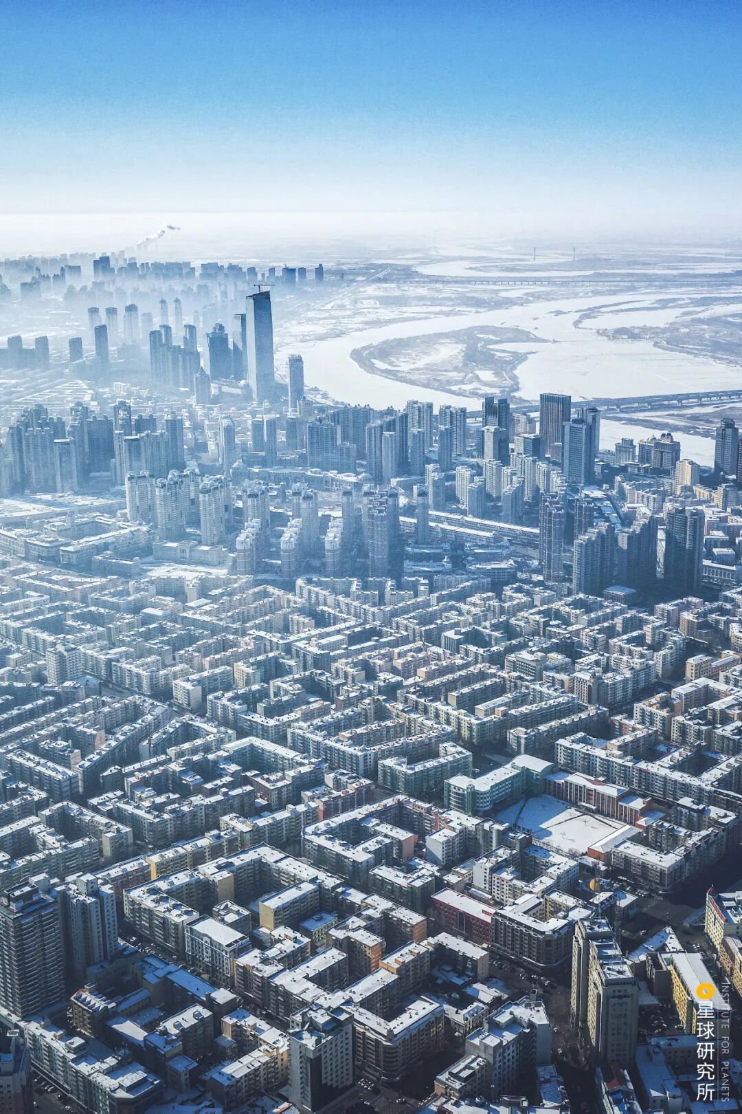 (请横屏观看,哈尔滨城市全景航拍,近处为太阳岛,中间是幽蓝的松花江,摄影师@刘项)