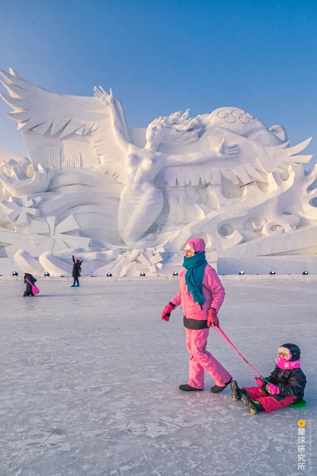 (雪博会的雪雕与冰面上的人们,摄影师@陈刚)