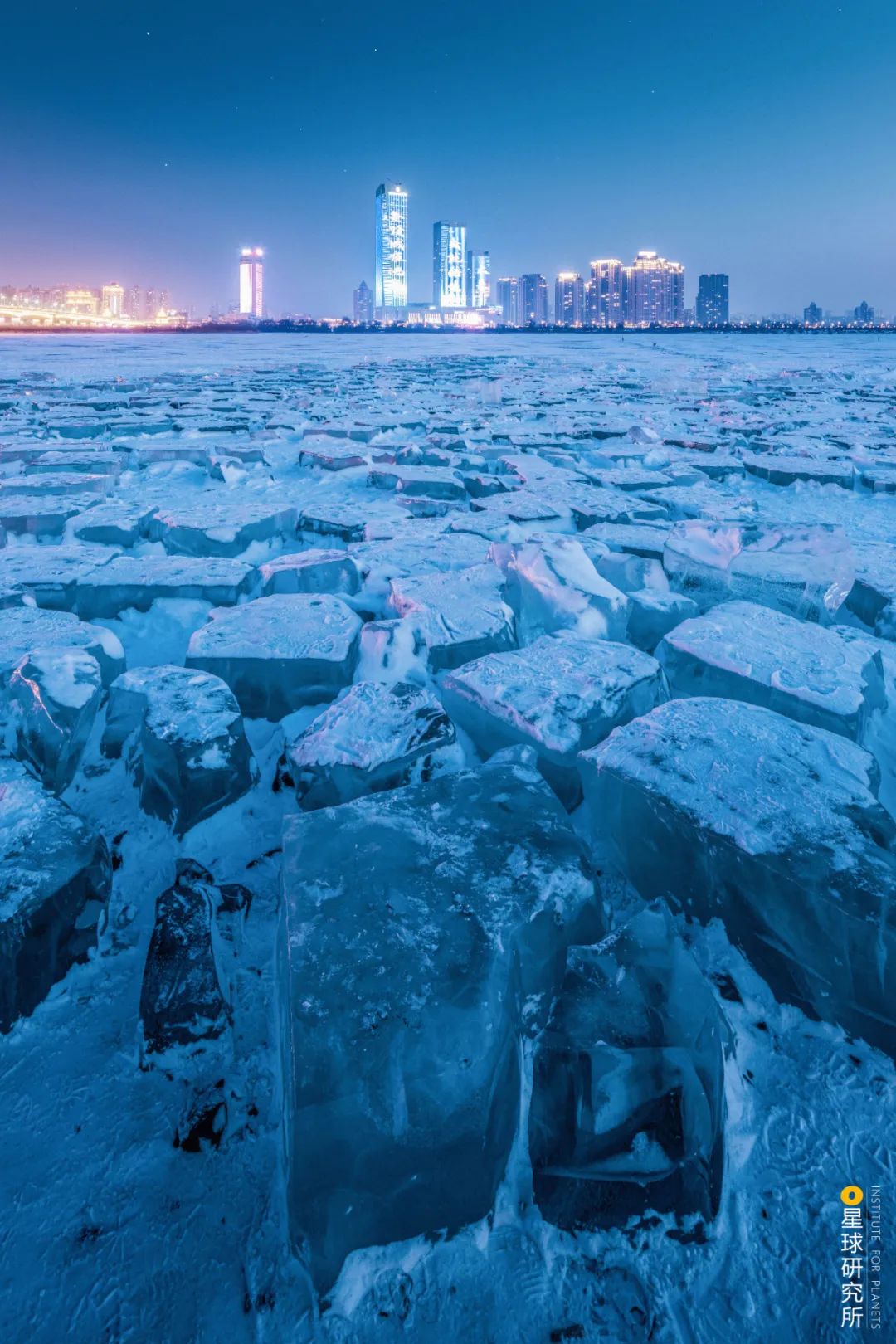 (封冻的松花江有一段是冰雕的采冰区域,采出的冰块堆在冰面上,晶莹剔透,摄影师@沈兆佳)