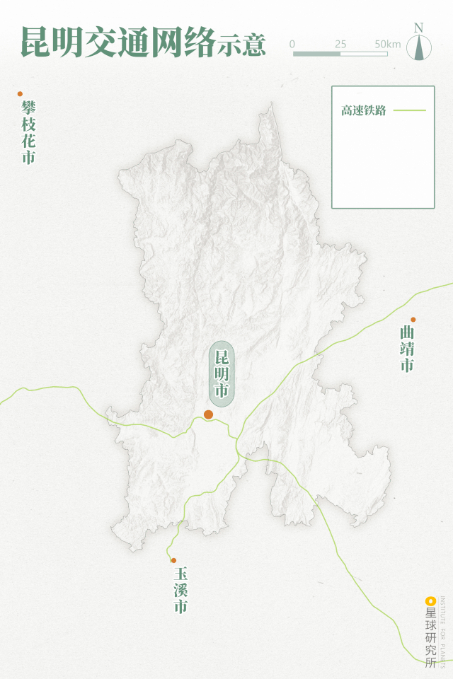 (昆明陆上交通网络示意,@巩向杰&王申雯/星球研究所)