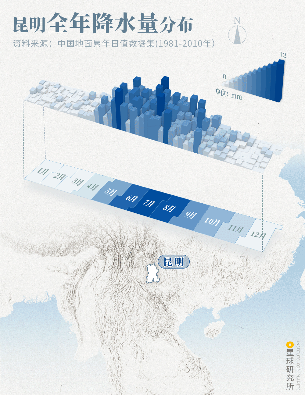 (昆明全年降水量分布,其中85%以上的降水集中在夏半年,制图@巩向杰&王申雯/星球研究所)